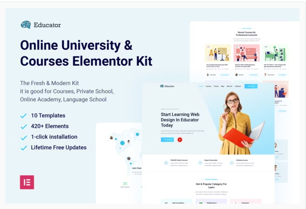 - Educator - Online University & Courses Elementor Template Kit : Educator – fresh & modern Education Elementor Kit. It works for: courses, preschool, primary school, secondary school, high and higher education. Also for college, university or academy, informal learning, institute. Furthermore, it is good for distance private schools, home-learning, tutoring, teaching, language school, course, class, training. Also for traditional public school, charter school, boarding school, virtual self-learning.