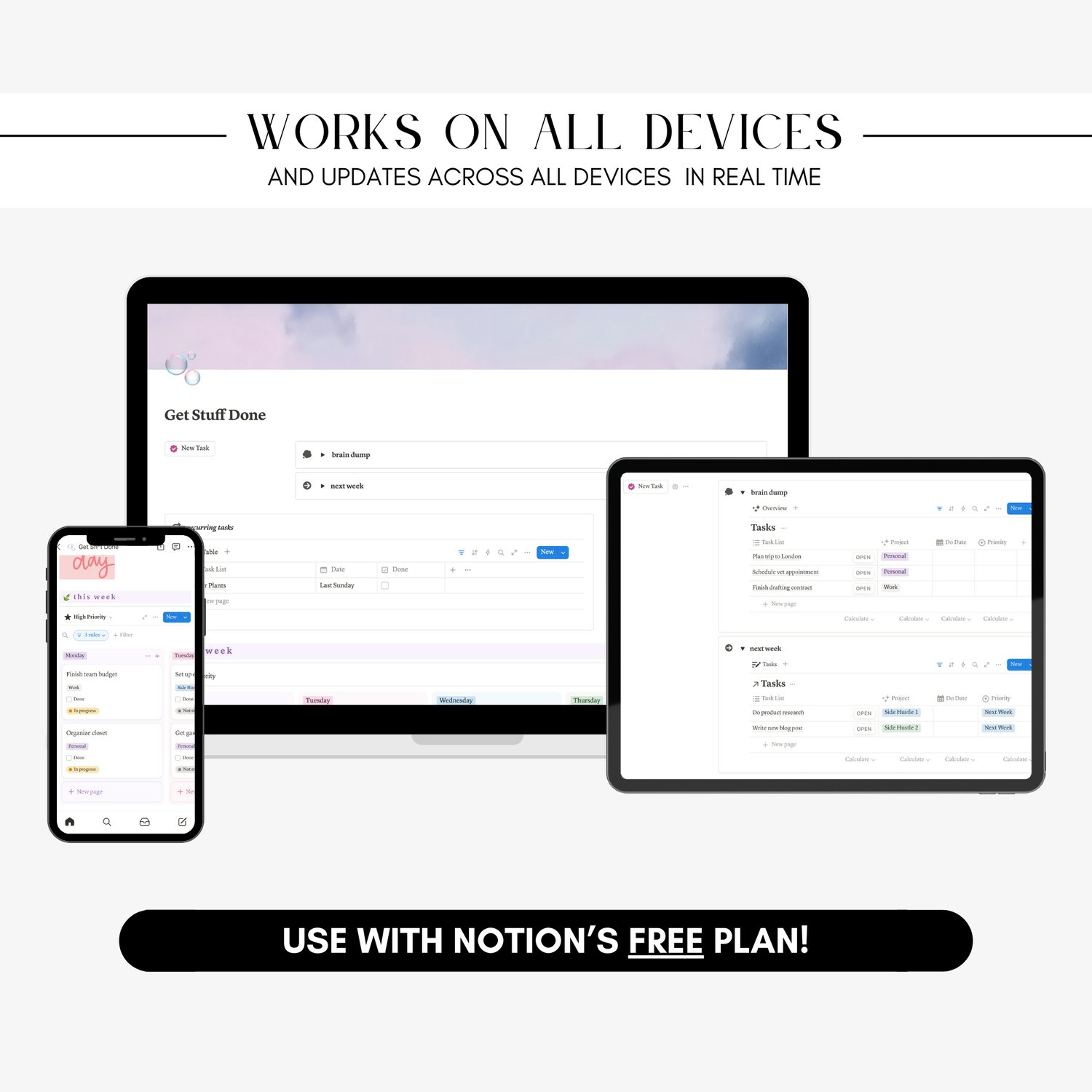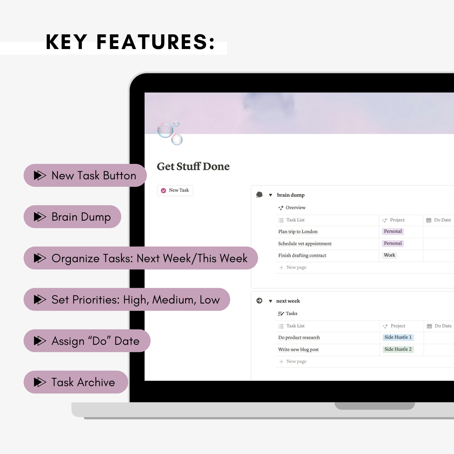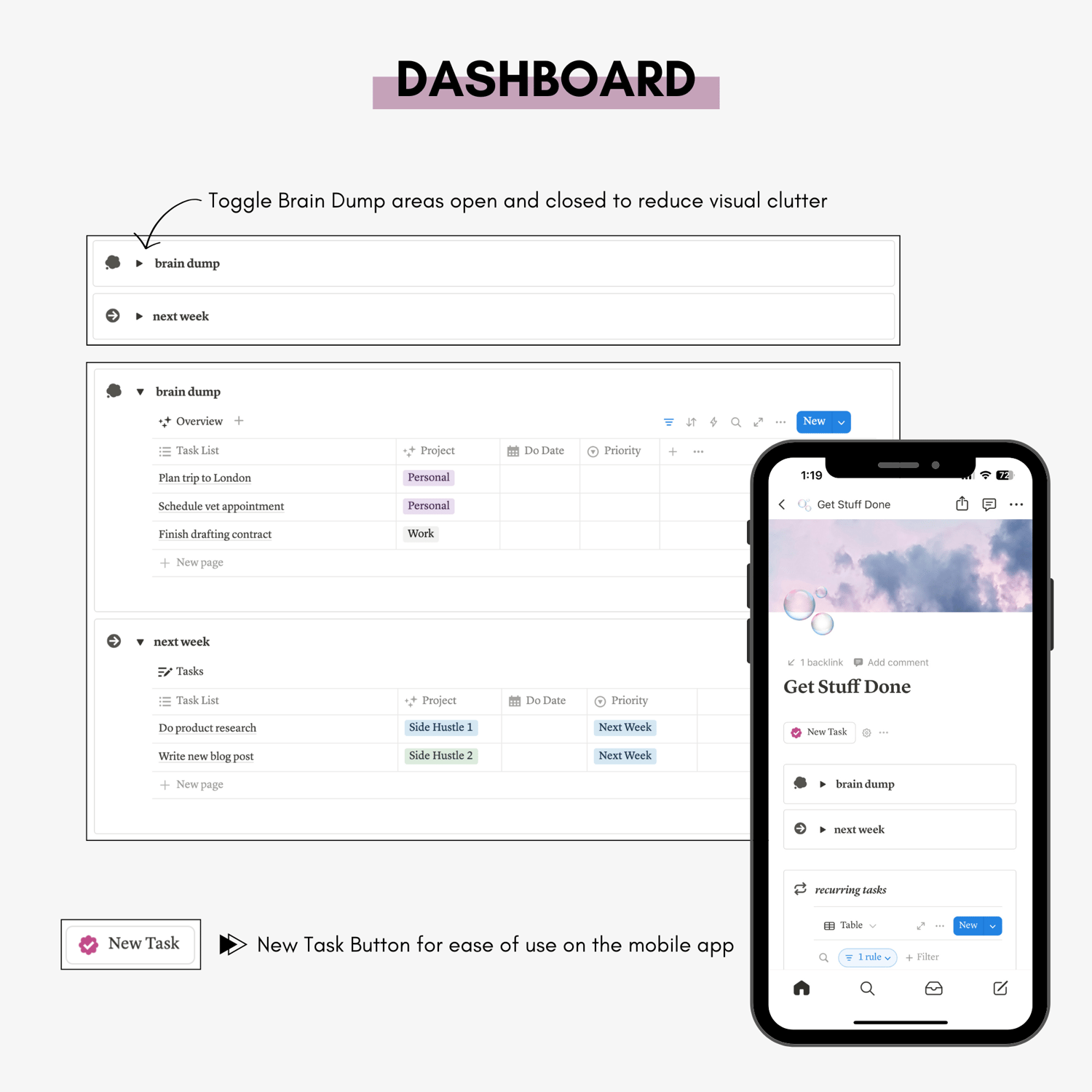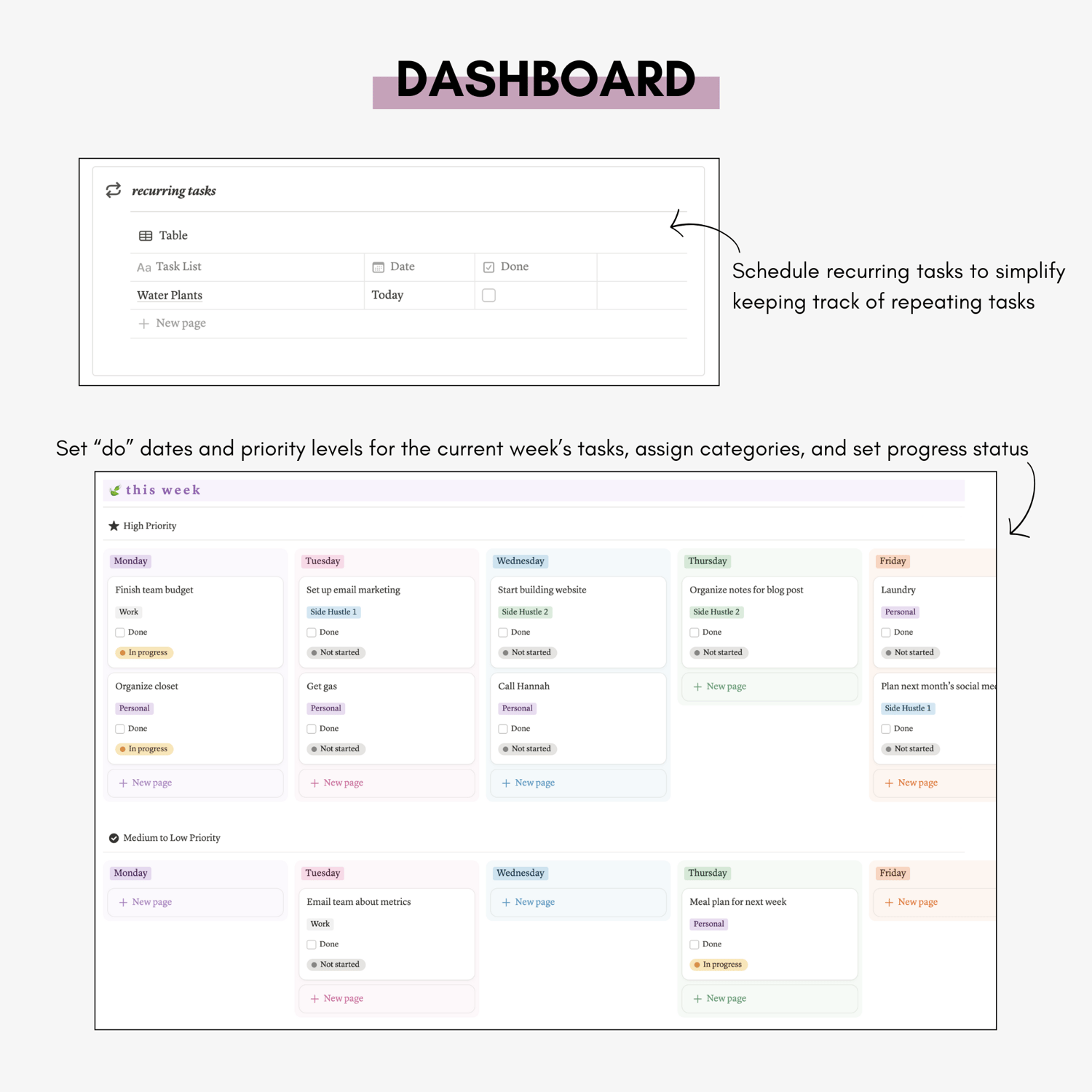 Unlock the ultimate way to organize your week with our customizable Notion Weekly Planner Template. Designed for busy individuals, this template lets you track work, personal tasks, and side projects in one seamless layout. Organize your week with features like a brain dump section, task categorization, task status tracking, recurring tasks, and an archive of completed tasks. Whether you’re managing deadlines or balancing personal commitments, this template helps you stay productive, organized, and focused.