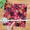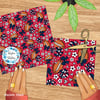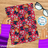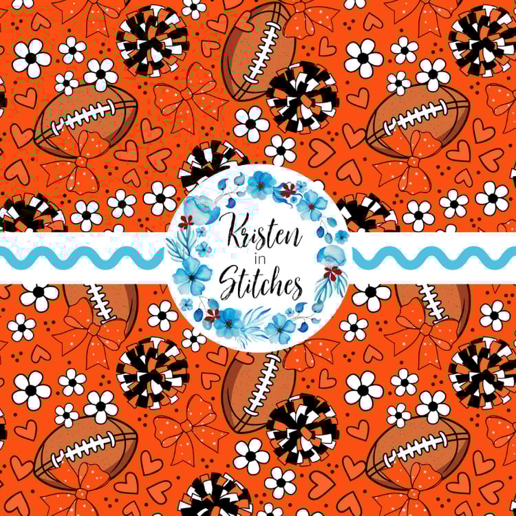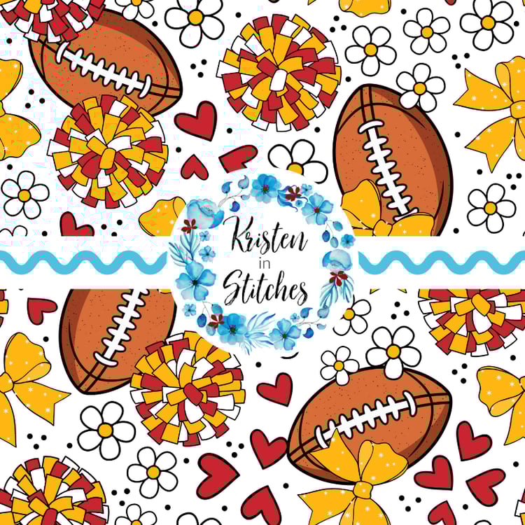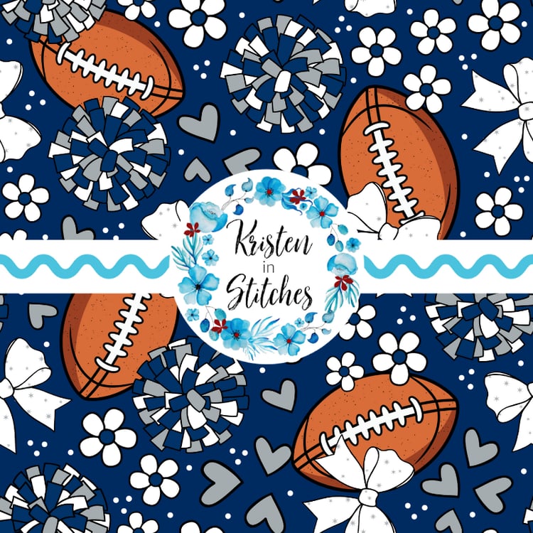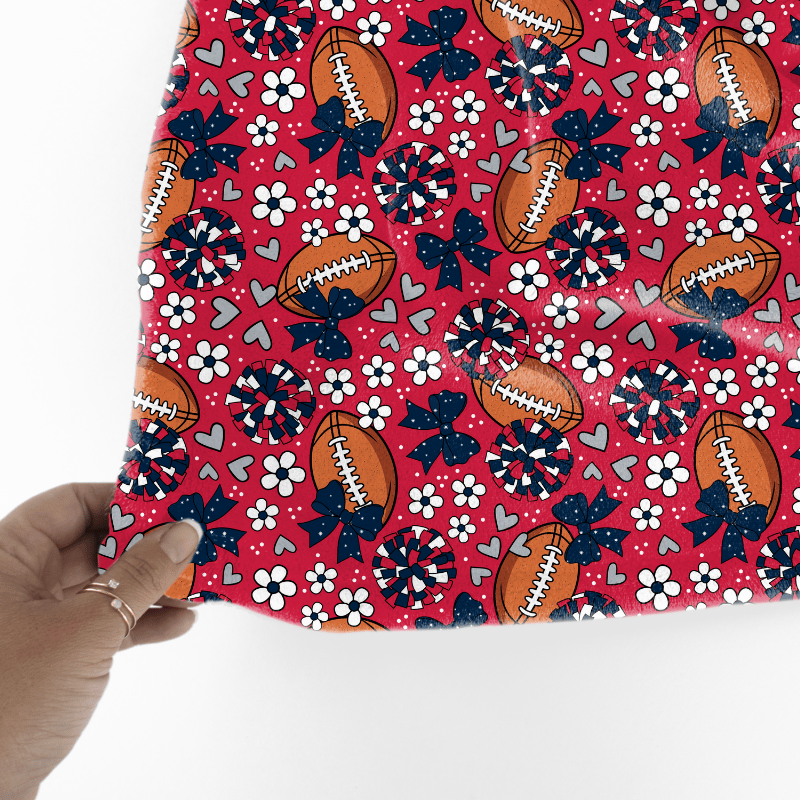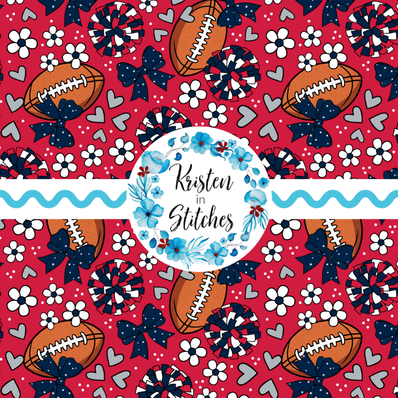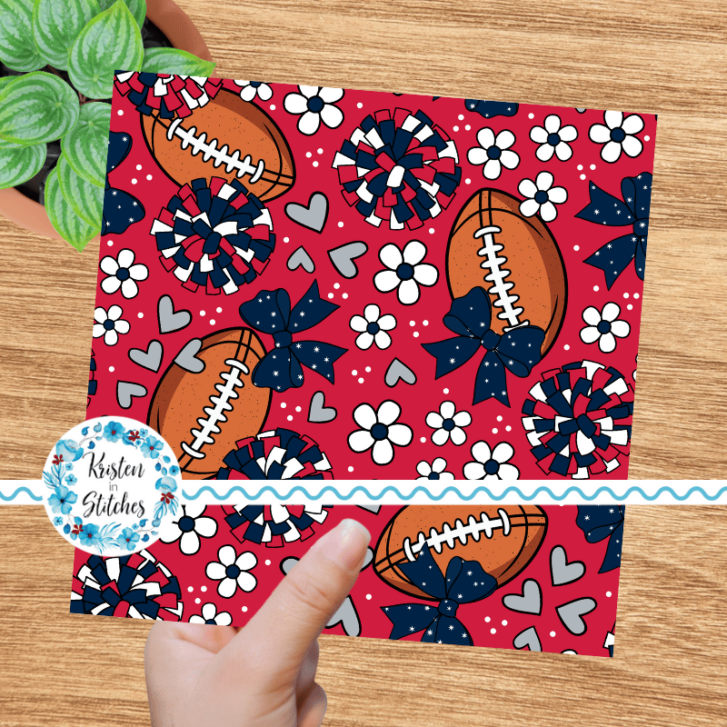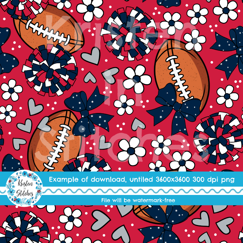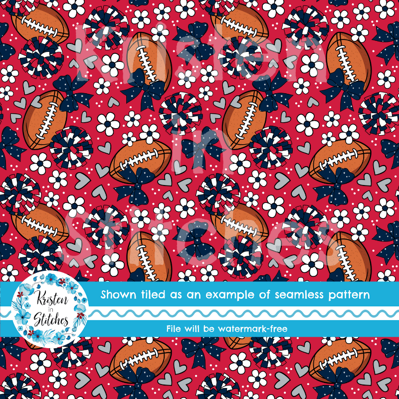 Floral pattern with daisy flowers, cheerleader bows, pompoms, footballs and hearts in New England Patriots colors, red, navy and silver.
