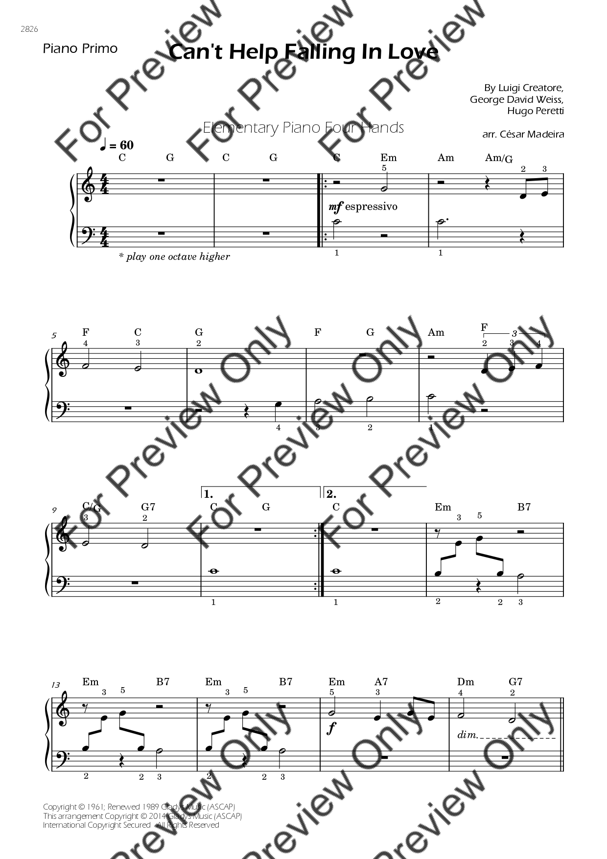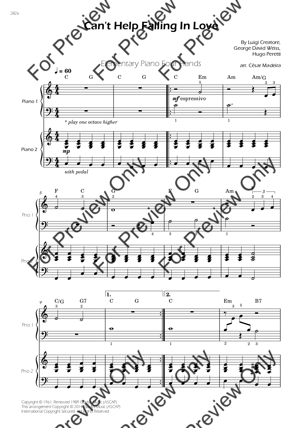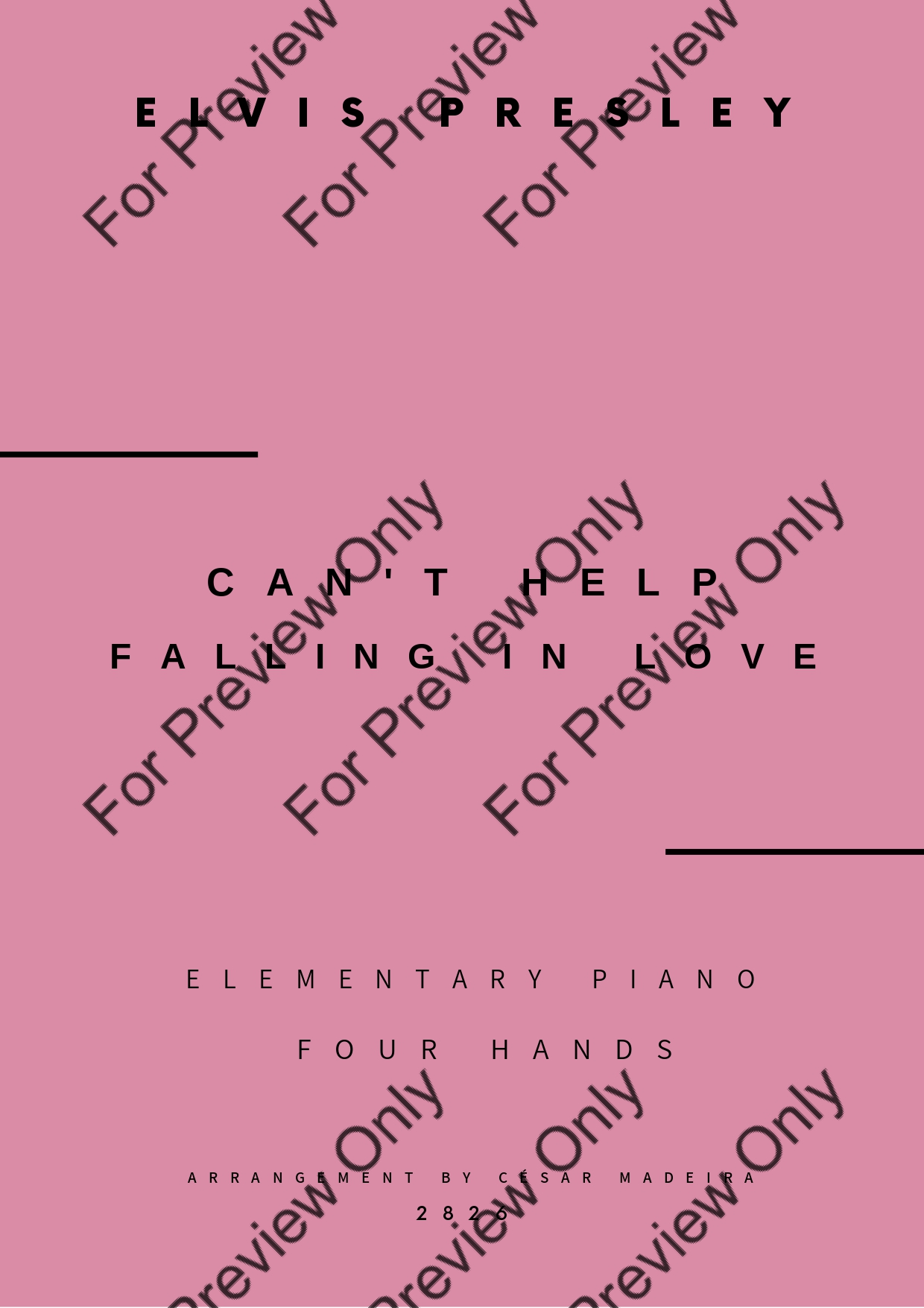 Can't Help Falling In Love by Elvis Presley. Arrangement for Elementary/Very Easy Piano Four Hands. With Full Score and Individual Parts. Have fun!