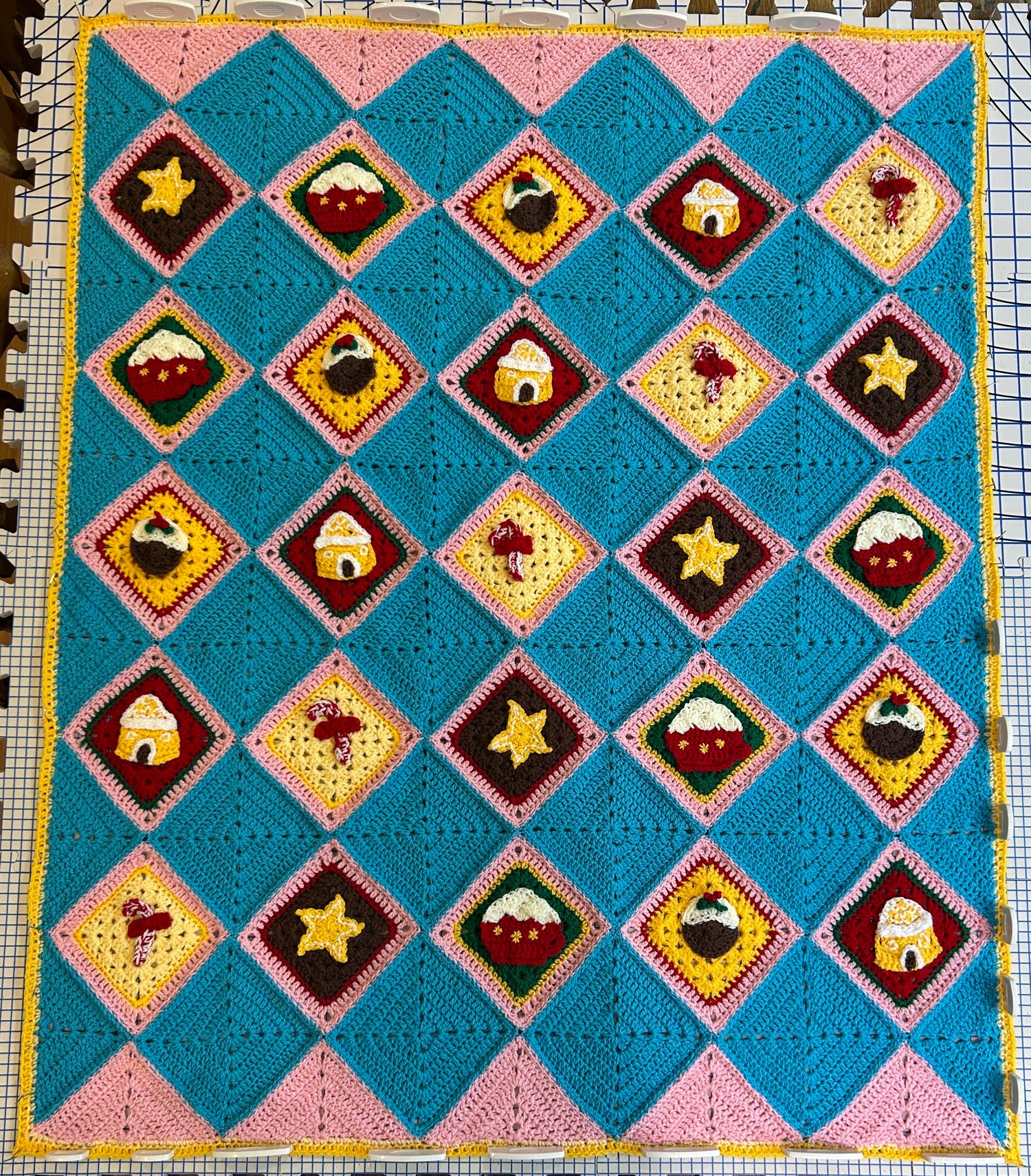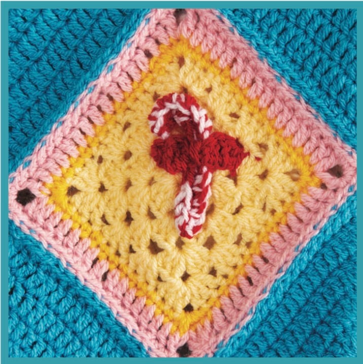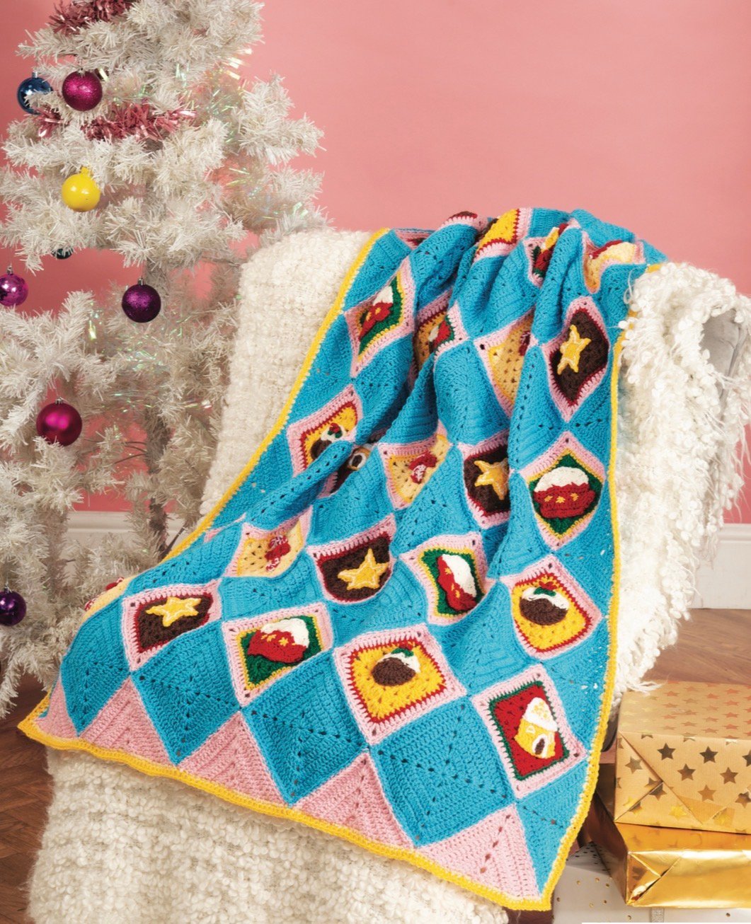 This cosy creation is bright and festive, with a retro twist—granny squares are stitched at a ninety-degree angle, forming charming diamond shapes. Each square is adorned with some of my favourite winter motifs: a candy cane, a Christmas pudding, a gingerbread house, a star cookie, and a mug of hot chocolate. The blanket combines classic granny squares, solid treble squares, and solid treble triangles, making it a joy to assemble for crafters of all levels.