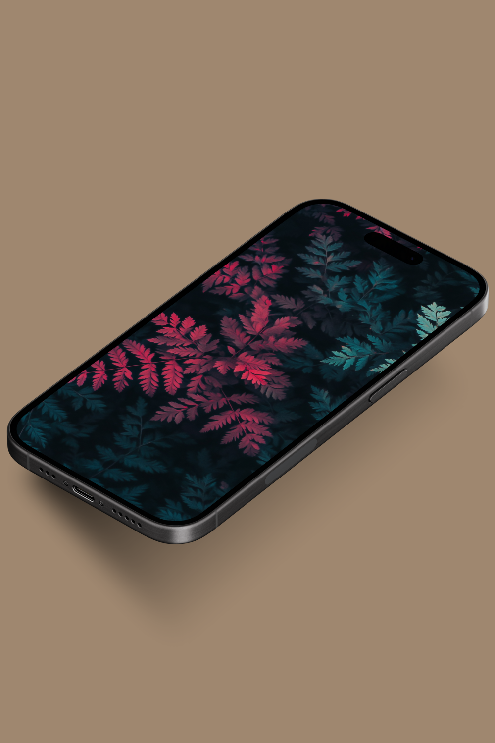 🌿 Mystic Foliage – Soft gradients of teal and crimson leaves in a dreamy night forest.