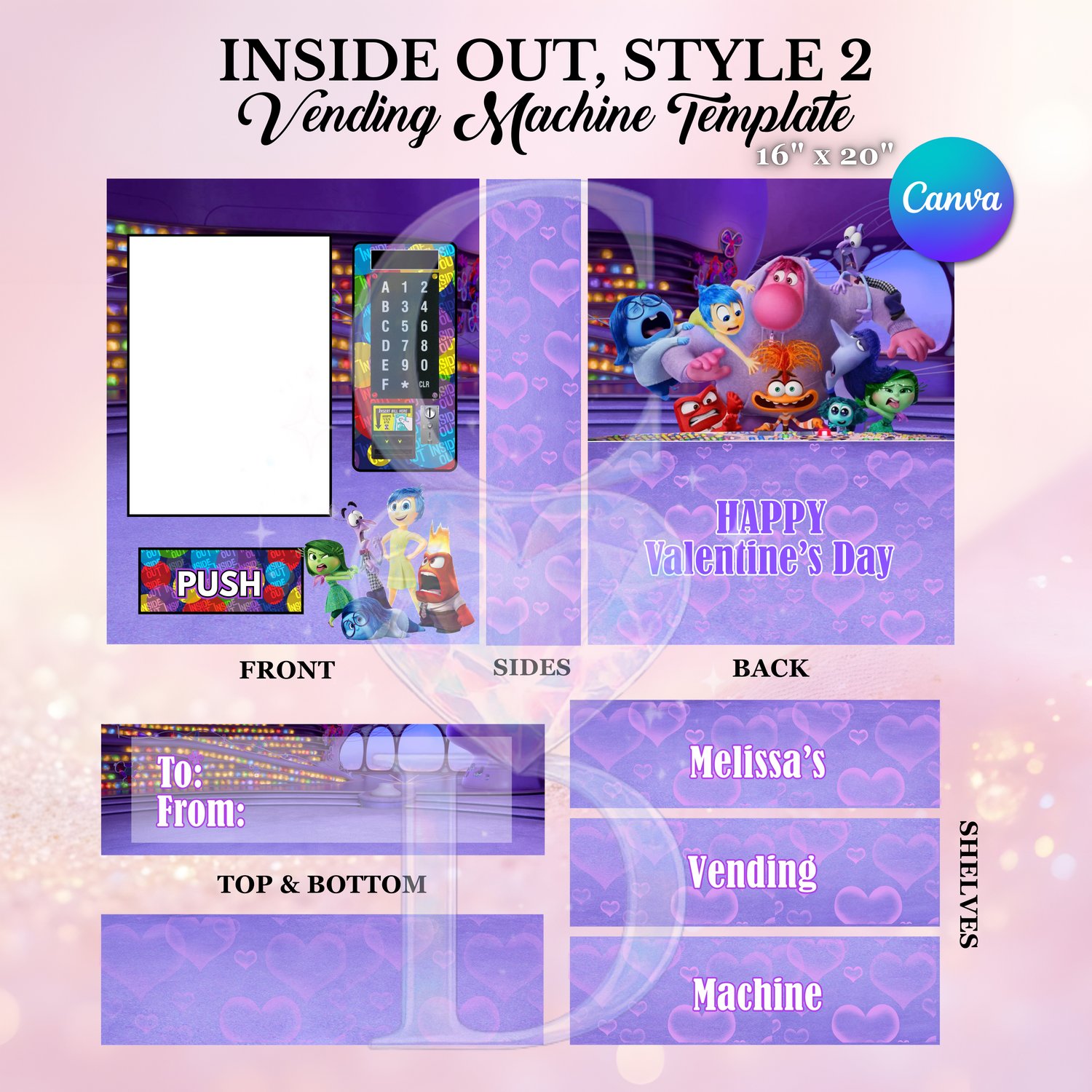 Create a softer, sweeter party moment with this Inside Out inspired vending machine template featuring a dreamy Valentine-style design. Sized at 16" x 20" and fully editable in Canva, this layout helps you build a beautiful, coordinated display that feels thoughtful, fun, and uniquely personal.