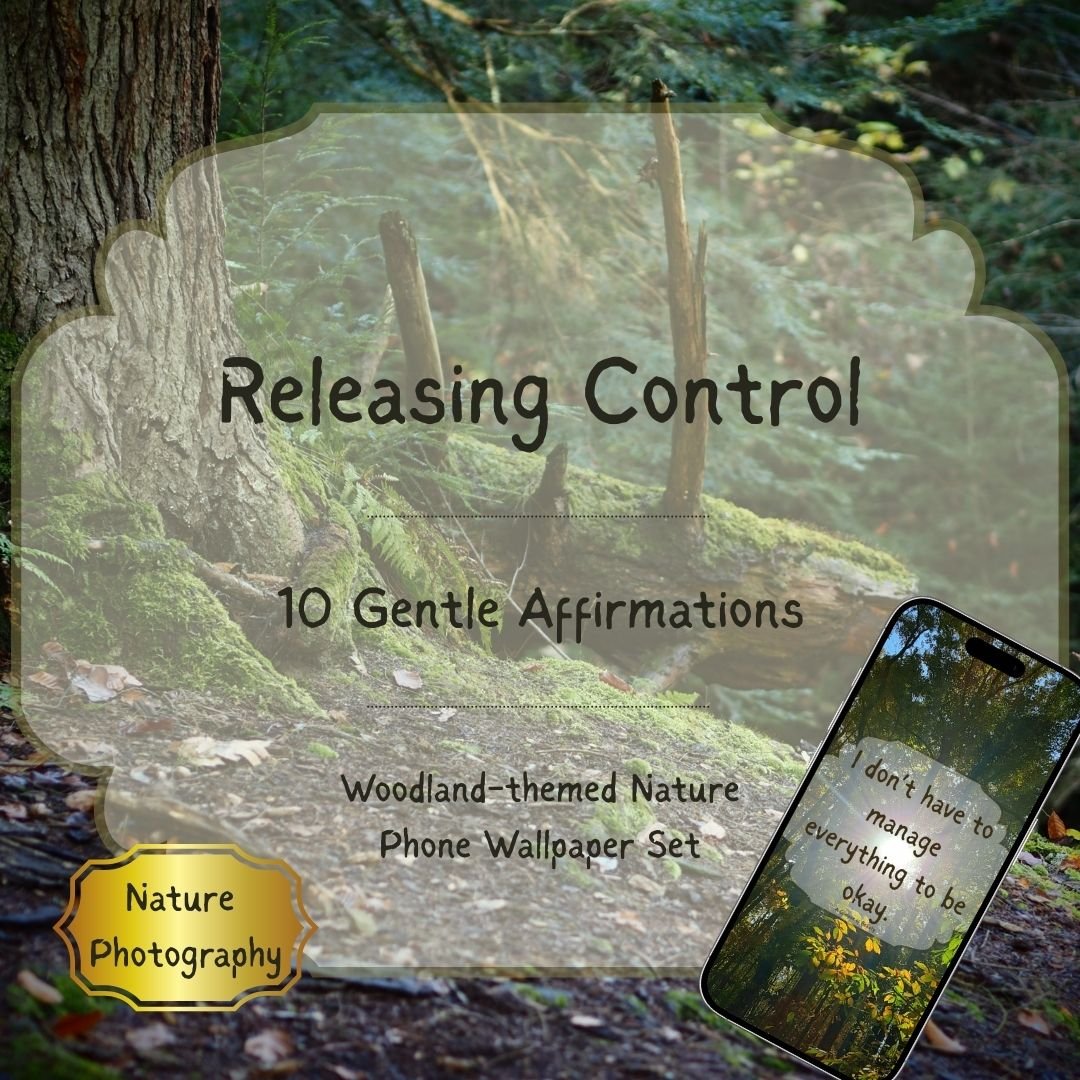 Healing and personal growth often begin with gentle reminders to treat ourselves with compassion. This collection includes 10 affirmations designed to support releasing control, paired with calming woodland nature photography. The peaceful forest imagery creates a grounding atmosphere that encourages reflection while the affirmations offer supportive reminders throughout your day. Each wallpaper is designed to serve as a quiet daily reminder on your phone, helping you stay connected to your intentions and personal healing journey.