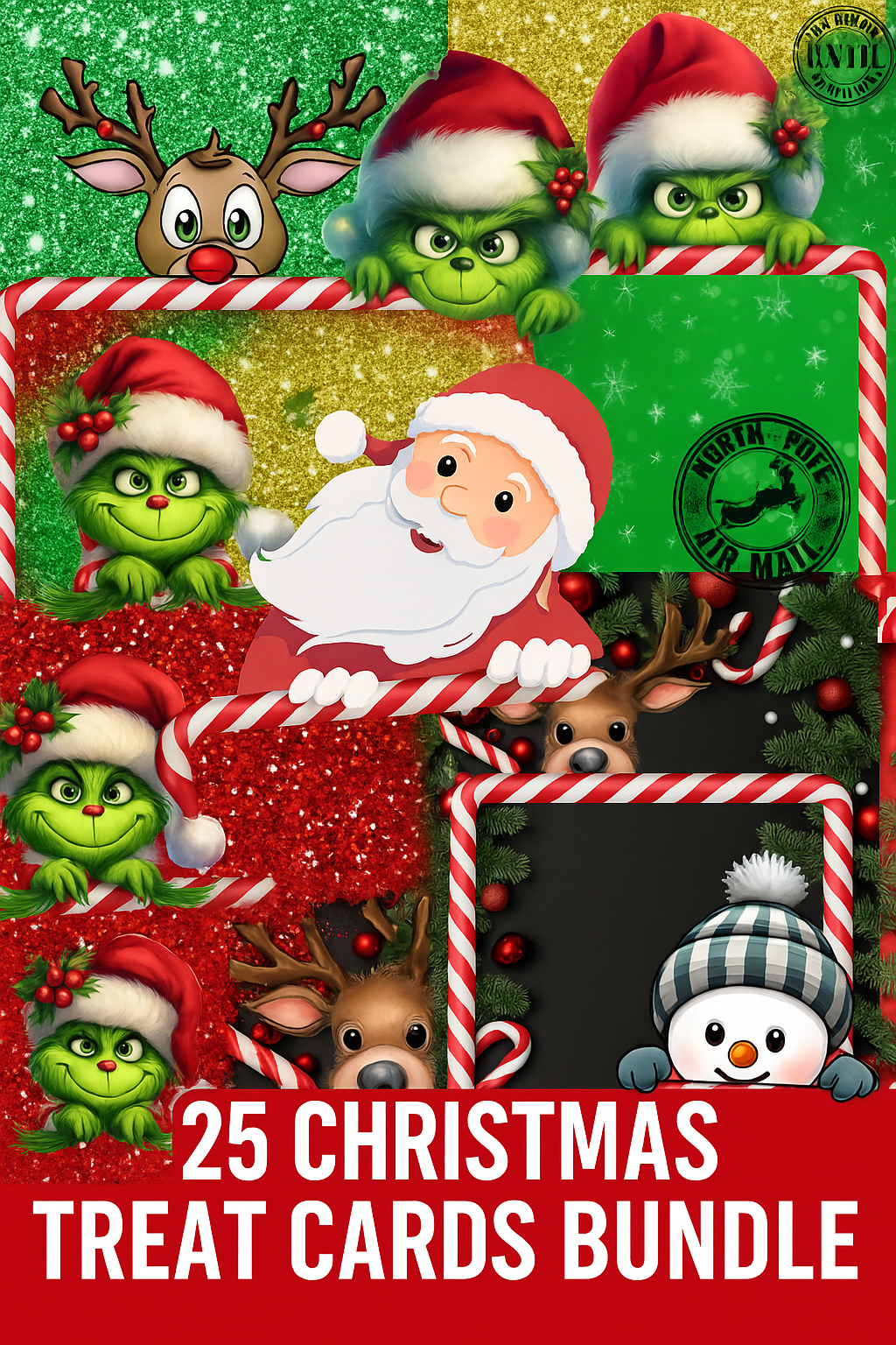 ✨ The cutest + most festive way to dress up holiday treats! This bundle gives you 25 unique Christmas treat card designs featuring adorable characters, glitter backgrounds, candy cane borders, and iconic holiday vibes. Perfect for small businesses, classroom gifts, stocking stuffers, Christmas parties, craft fairs, customer thank-yous, and digital creators who need ready-to-print holiday magic.