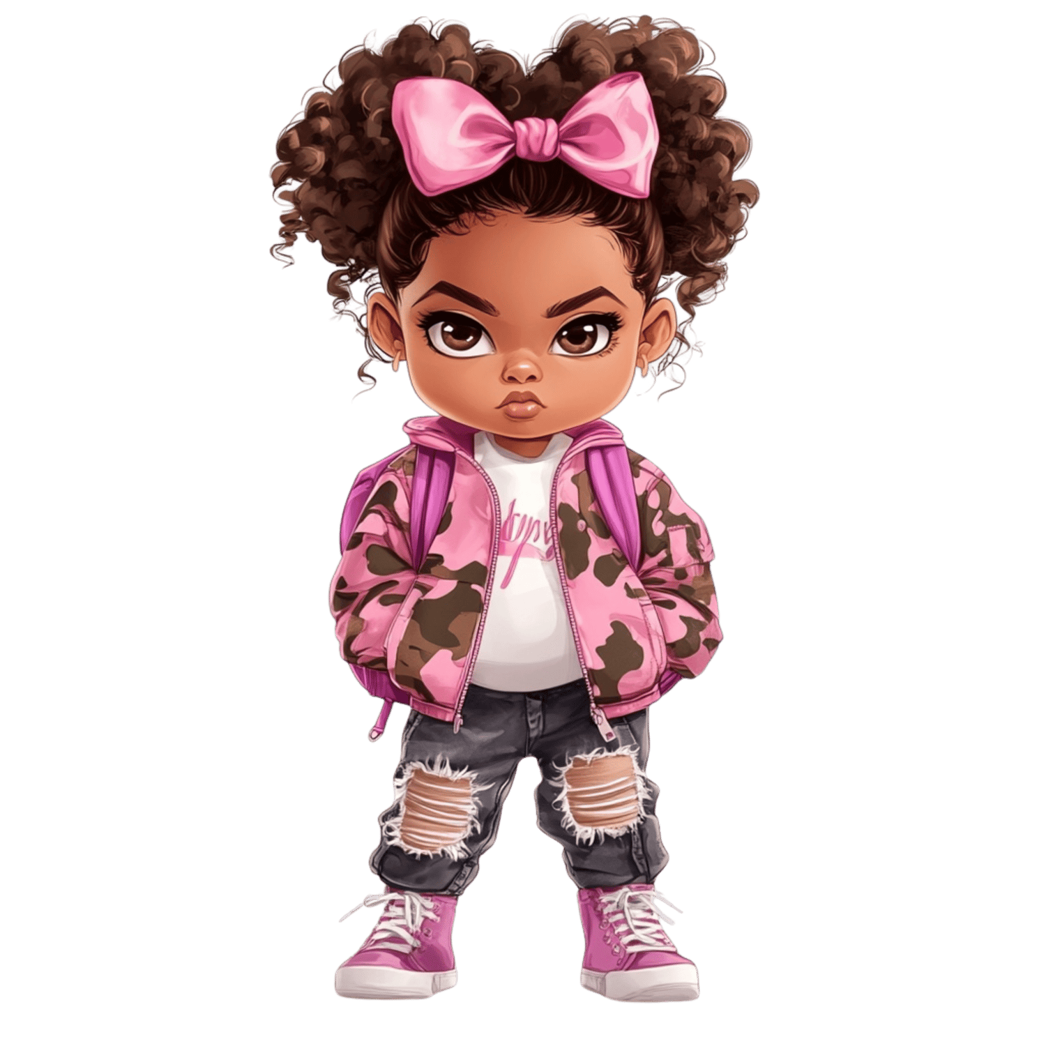 This cute digital design features a confident curly-haired little girl rocking a pink camo jacket, distressed jeans, pink kicks, and a matching bow and backpack. Perfect for back-to-school projects, journals, T-shirts, and more!