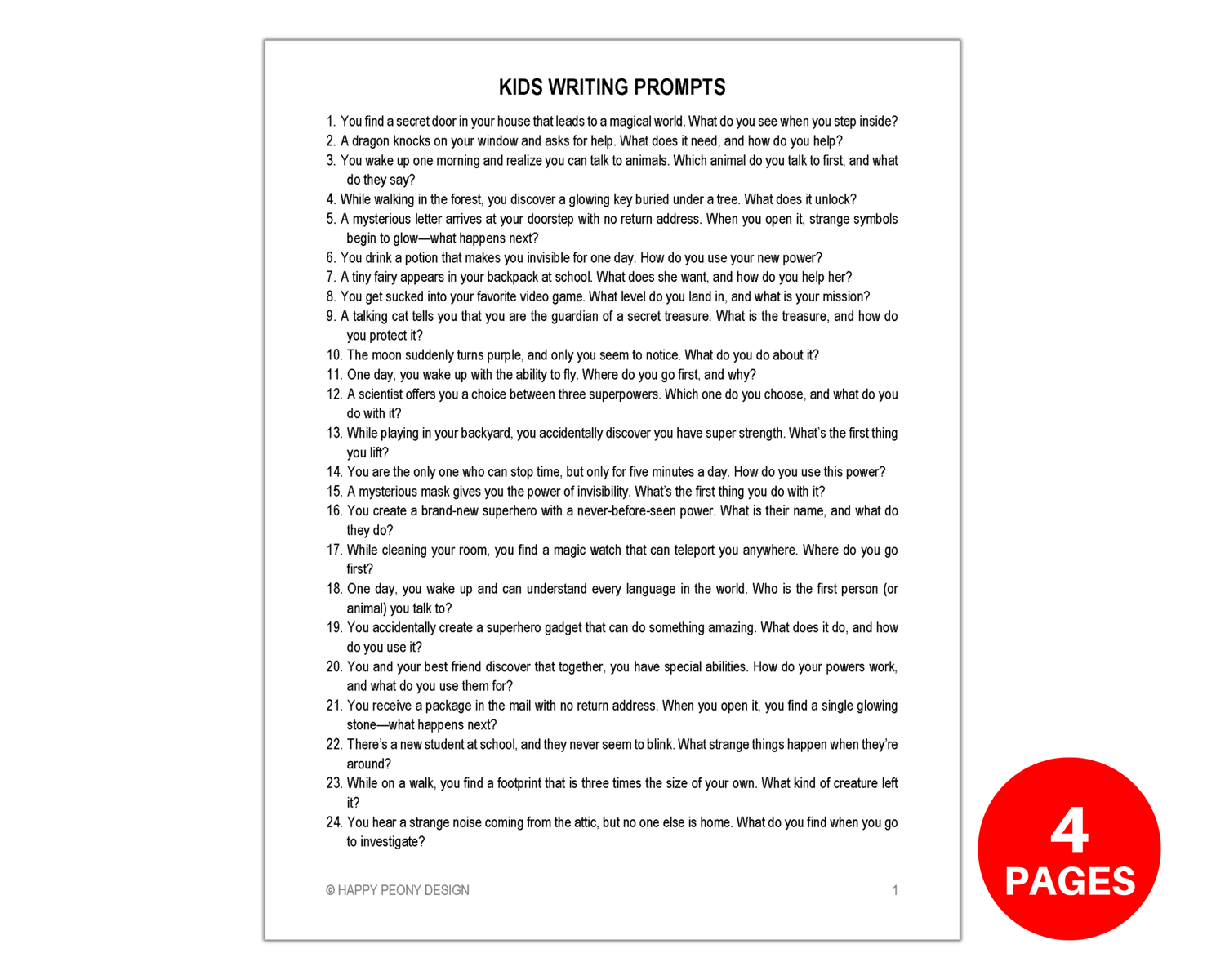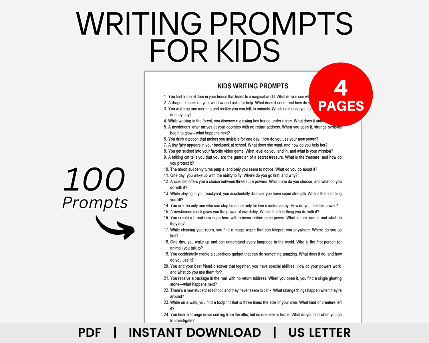 Let your child’s imagination run wild with these kids writing prompts. From magical creatures to exciting adventures, each prompt is a ticket to a world of creativity and fun. These writing prompts for kids are a fantastic way to inspire writing, explore new ideas, and build storytelling skills while having a blast. Watch your child’s stories come to life with just a few words and a lot of imagination.
