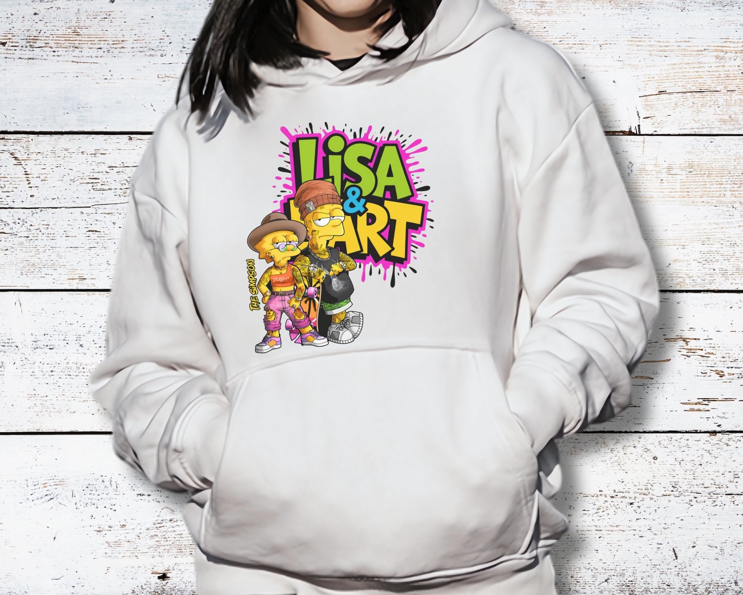 PNG digital download ready for sublimation. Creative urban-style design featuring Lisa and Bart from The Simpsons. Ideal for custom t-shirts, hoodies, and streetwear products.