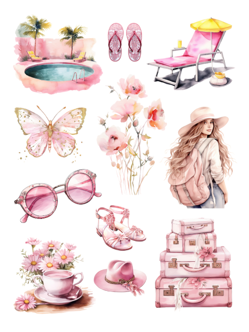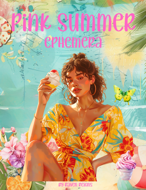 Pull out your scissors and glue and dive into the magical world of pink summer ephemera with picnic items, scenery, summer vibes, sunglasses, umbrellas, hats, beach blankets, spa elements, surfboards, beach elements, flowers, ice cream, treats, snack trucks, beach balls, sand, oceans, baskets, beautiful girls, cameras, kayak, seashells, fun in the sun, and much more with this artistically beautiful ephemera book.