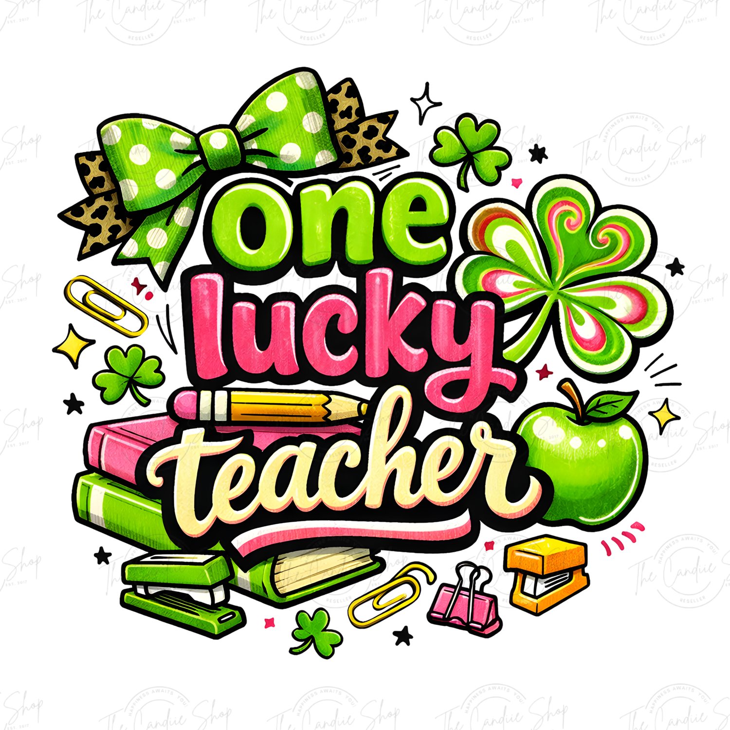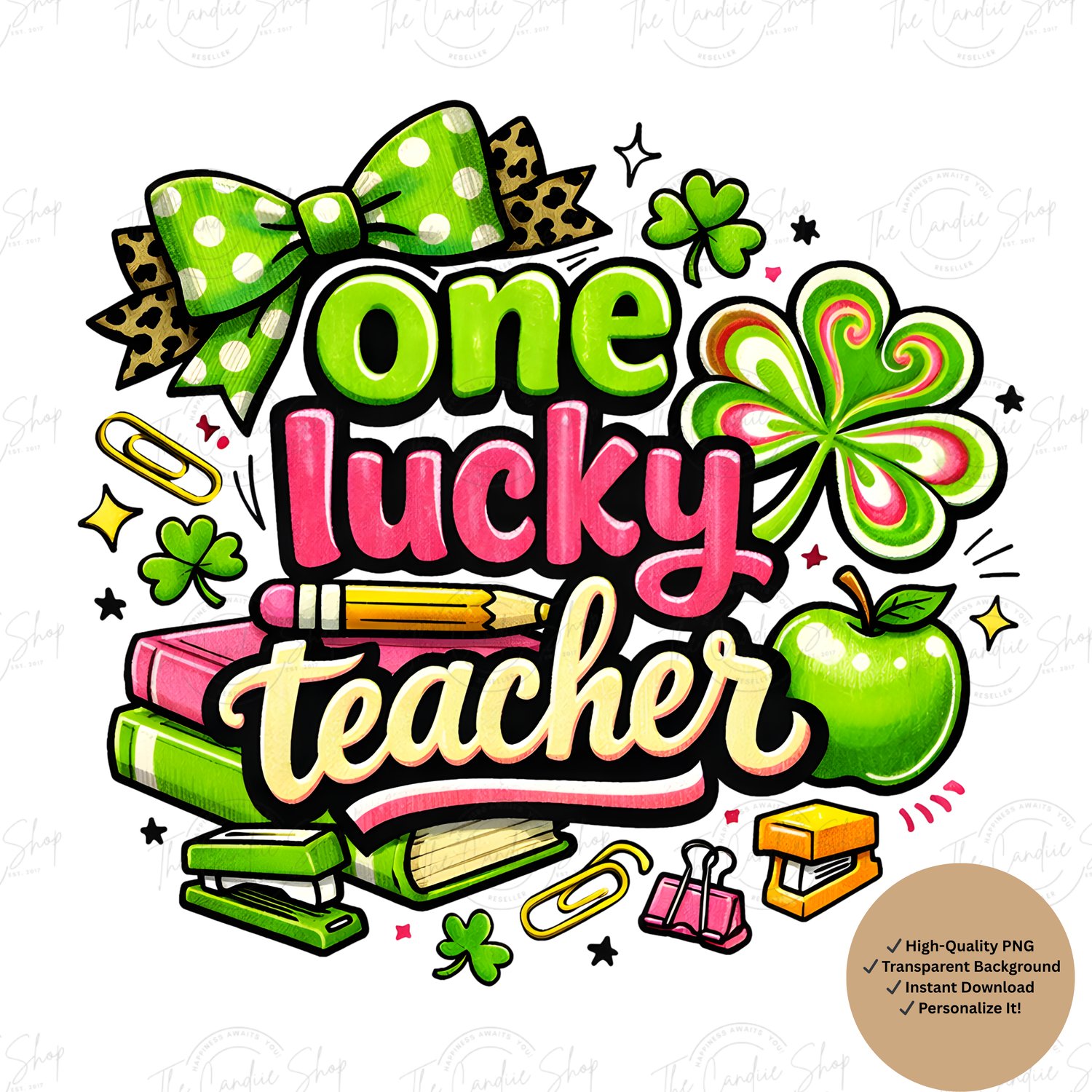 Celebrate St. Patrick’s Day in the classroom with this fun and colorful One Lucky Teacher PNG design! 🍀💚 This hand-drawn style teacher graphic features playful typography, shamrocks, books, a pencil, apple, bow, and classroom-themed elements—perfect for creating festive teacher shirts, mugs, tote bags, stickers, and more.