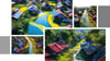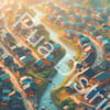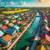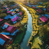 A village like Pua, Pua District, Nan, Thailand, bathed in natural daylight, creating soft, pleasing shadows. The village has bright and cheerful colors that make the place stand out. There are meandering water canals that wind through the village, making it an inviting place to explore. The view is from a bird's-eye perspective for a unique angle, and the village has a playful cartoon-style vibe.