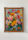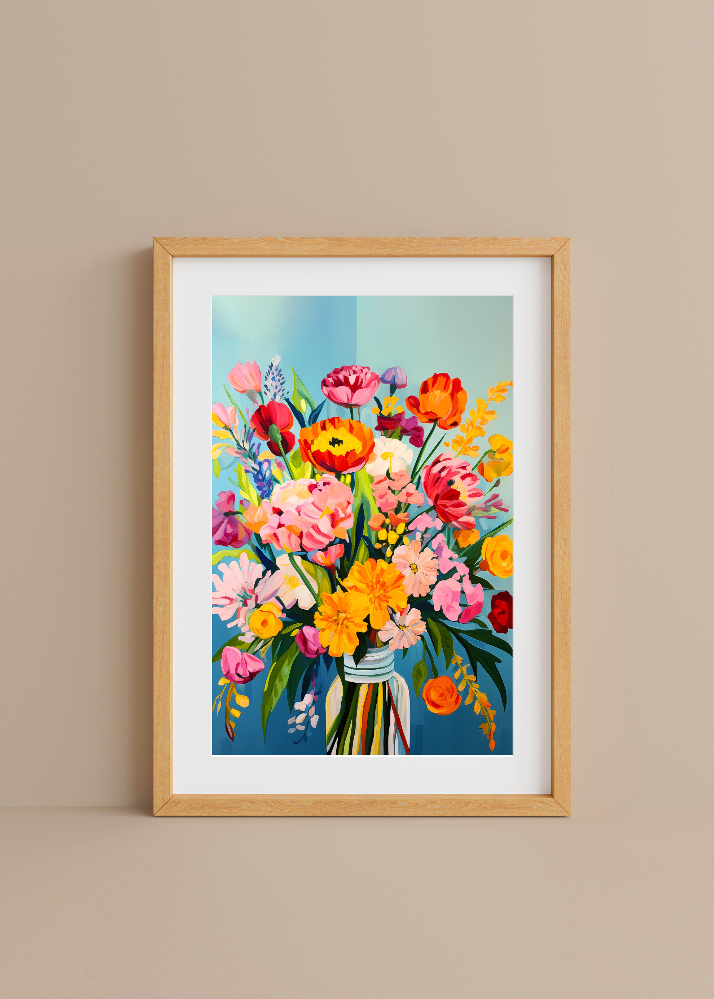 Midsummer Melody— An exuberant garden caught mid-song. Warm oranges, bold reds, and coral-toned florals rise from a whimsically striped table, their colors dancing against the turquoise backdrop. This print is of the kind of arrangement that hums with sunshine and the quiet thrill of being seen.