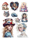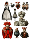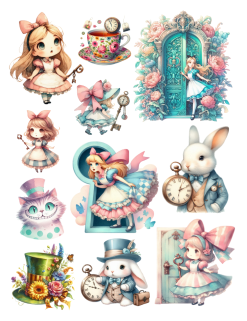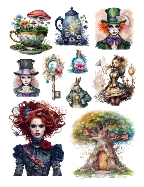 Pull out your scissors and glue and dive into the magical world of Alice. There are over 240 ephemera elements including diverse Alice's, mushrooms, tea parties, tea cups, mirrors, clocks and twisted hallways, staircases to heaven, magical lands and forests and much more.