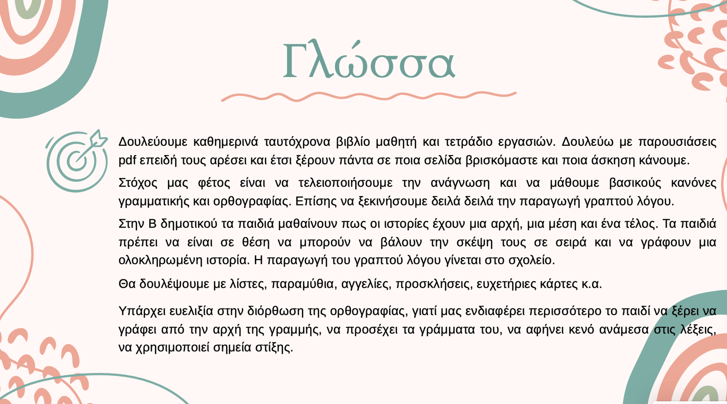 Δουλεύουμε με βιβλία μαθημάτων και τετράδια εργασιών. Στόχος είναι η ανάπτυξη βασικών γλωσσικών δεξιοτήτων. Στην Β’ τάξη, οι μαθητές μαθαίνουν να διαβάζουν και να γράφουν με μεγαλύτερη αυτονομία.