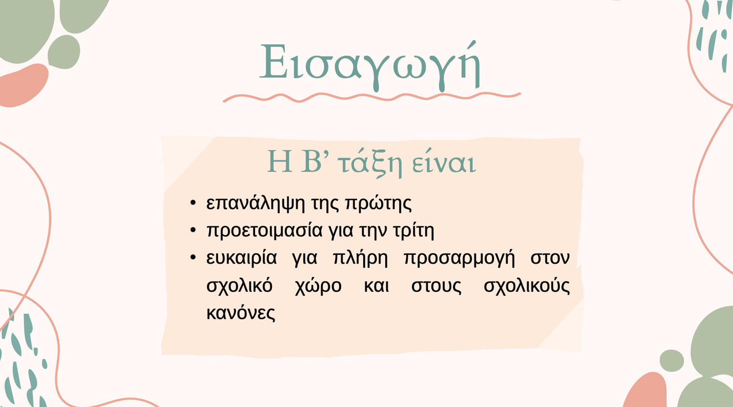 Η Β’ τάξη είναι μια σημαντική χρονιά, καθώς επαναλαμβάνει τη γνώση της πρώτης τάξης και προετοιμάζει τους μαθητές για την τρίτη. Αυτή η περίοδος προσφέρει ευκαιρίες για πλήρη προσαρμογή στον σχολικό χώρο και στους κανόνες του.