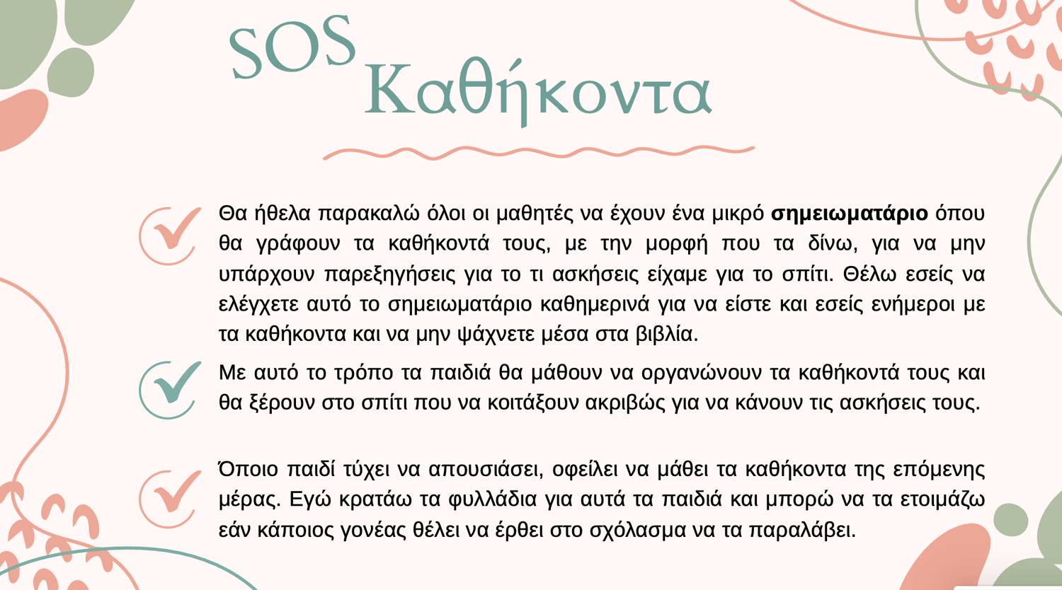 Θα ήθελα όλοι οι μαθητές να έχουν ένα μικρό σημειωματάριο για να καταγράφουν τα καθήκοντά τους. Αυτό θα τους βοηθήσει να οργανώνουν τη δουλειά τους και να παρακολουθούν την πρόοδό τους.