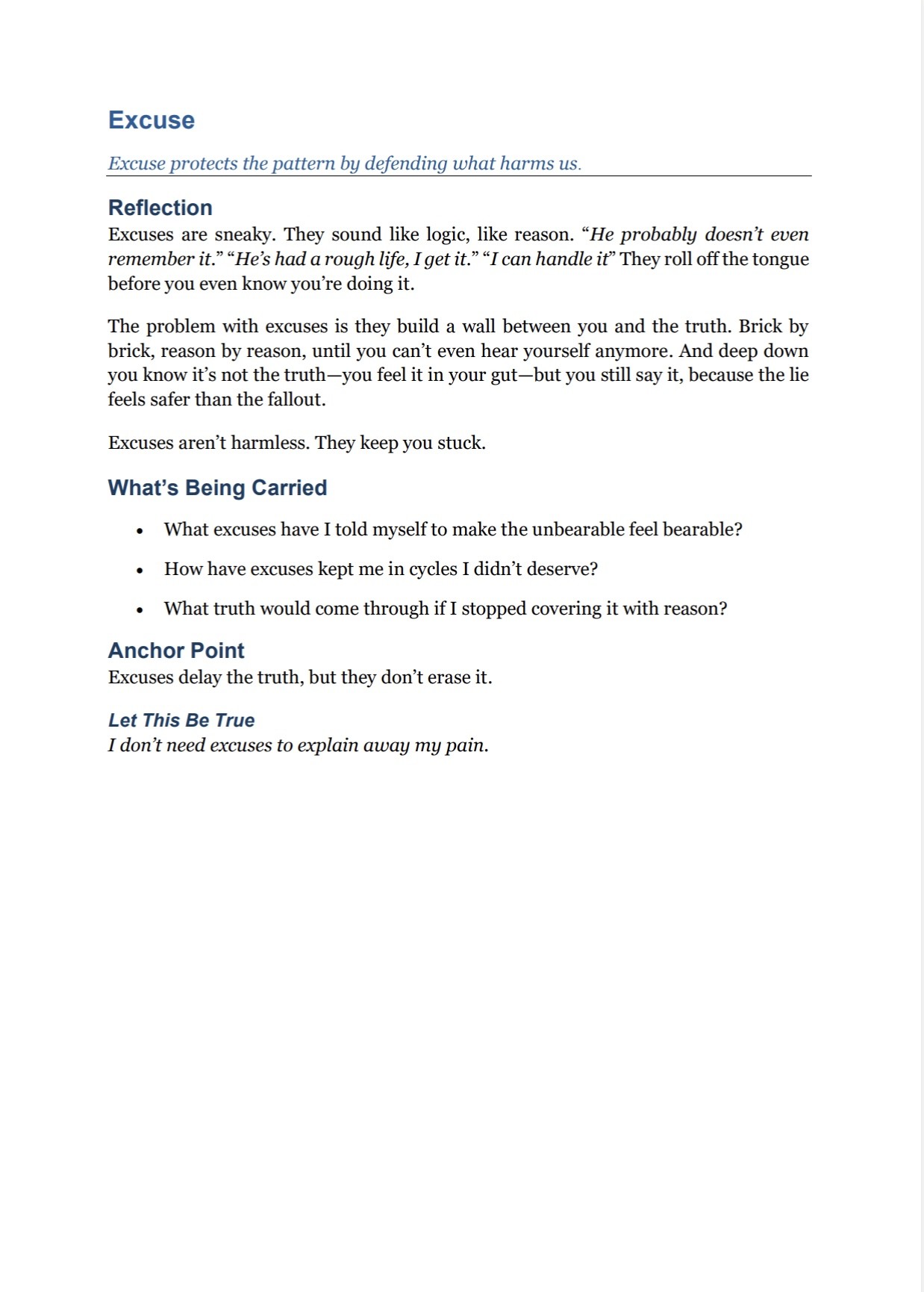 Each word — Denial, Excuse, Corrosion, Breaking Point, Realization, Separation, Cycle, Rebuild, Redefine, Rise, and Living It — marks a moment of truth: a chance to see clearly, choose differently, and reclaim your power.