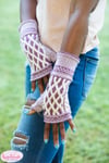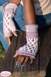 These romantic mitts were inspired by Medieval windows, doorways, and tracery. Despite their ornate appearance, they are practical too. They have long cuffs to fit under your coats or sweaters and a thumb gusset to allow greater freedom of movement. The dramatic front is mainly accomplished through increases and decreases, with just a few color cables. The back features a simple peerie motif which echoes elements in the rest of the design. Latvian braids set off the design perfectly.
