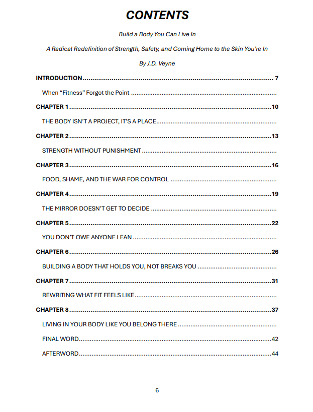 In Build a Body You Can Live In, J.D. Veyne dismantles the toxic myths of modern fitness culture and replaces them with something deeply human—a return to your body as a place of safety, trust, and truth.