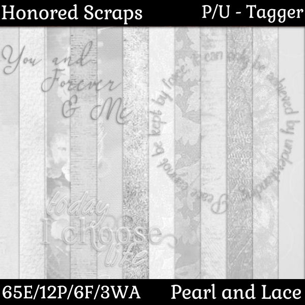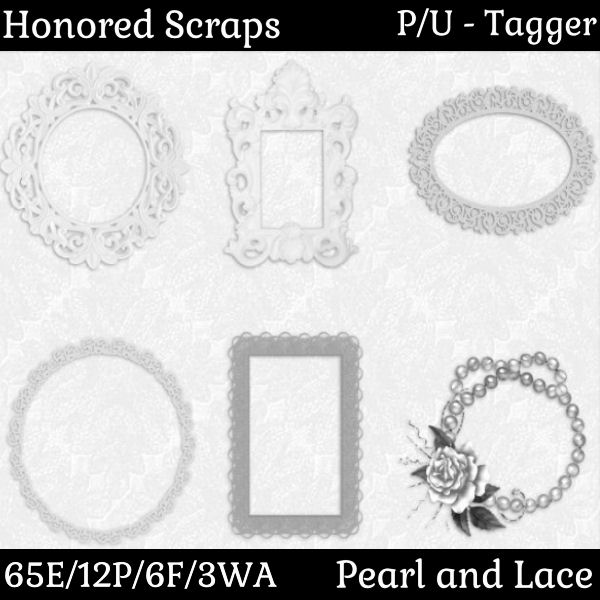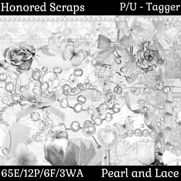 Pearl and Lace is a tagger kit that consists of 65 elements, 12 papers, 6 frames and 3 word art.