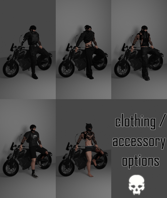 » Accessories| Cyber Arm/Neck - Arm/Chest/Hip Straps - Helmet - Piercings - Mask - Backpack - Rings - Skeleton Tail/Ribs - Vest - Lizard Button