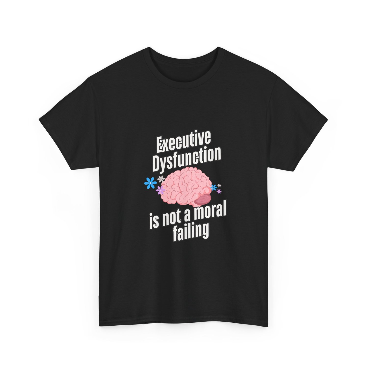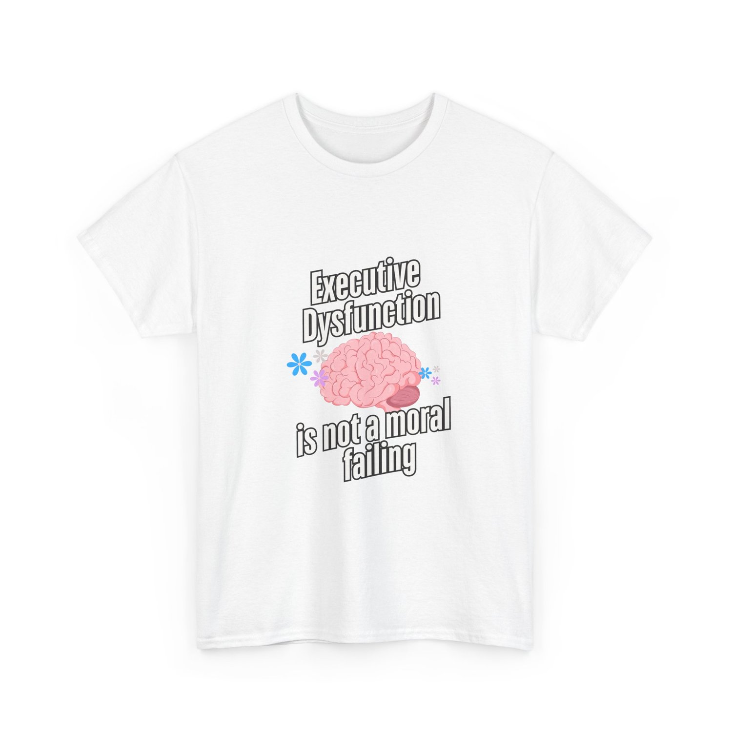 Soft, straightforward, and quietly powerful — this tee carries a gentle message for anyone who lives with executive dysfunction. A delicate illustrated brain in pastel pink sits beneath bold, slightly askew type that reads “executive dysfunction is not a moral failing.” Wear it as a small act of solidarity: it’s the kind of shirt that starts conversations without shouting. The relaxed, classic fit and smooth, medium-weight cotton make it easy to layer under a cardigan for low-energy days or pair with jeans for quick errands. Thoughtful details like a ribbed collar that keeps its shape and a tear-away label ensure comfort all day. Ethically sourced cotton and quality printing keep the design crisp and soft over many washes.
