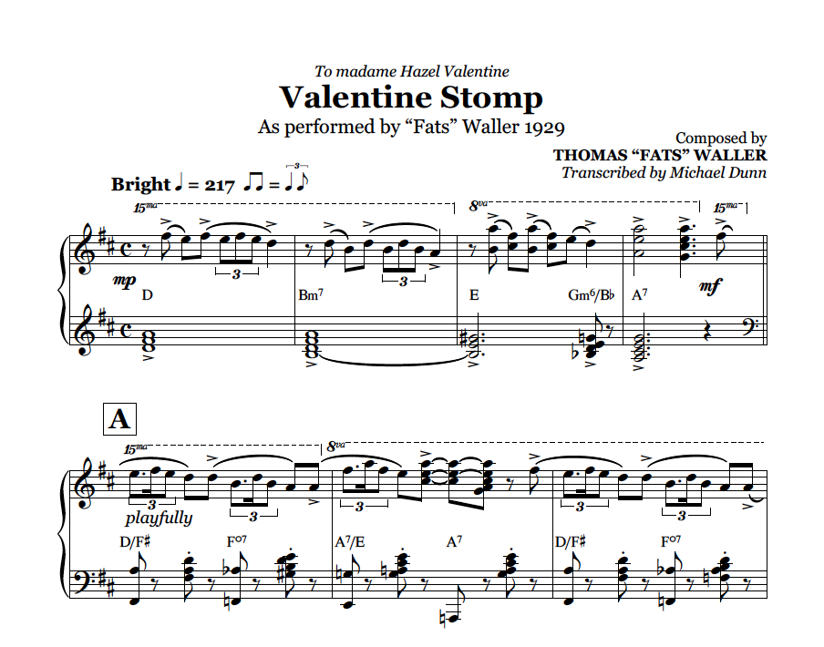 Here’s my transcription of Fats’ classic piano solo from 1929, Valentine Stomp, dedicated to a Madame Hazel Valentine, owner of the popular “Daisy Chain” parlour of the times, an establishment often frequented by Fats where he would play and drink and enjoy the company, according to Fats' son, Maurice Waller's memoir.