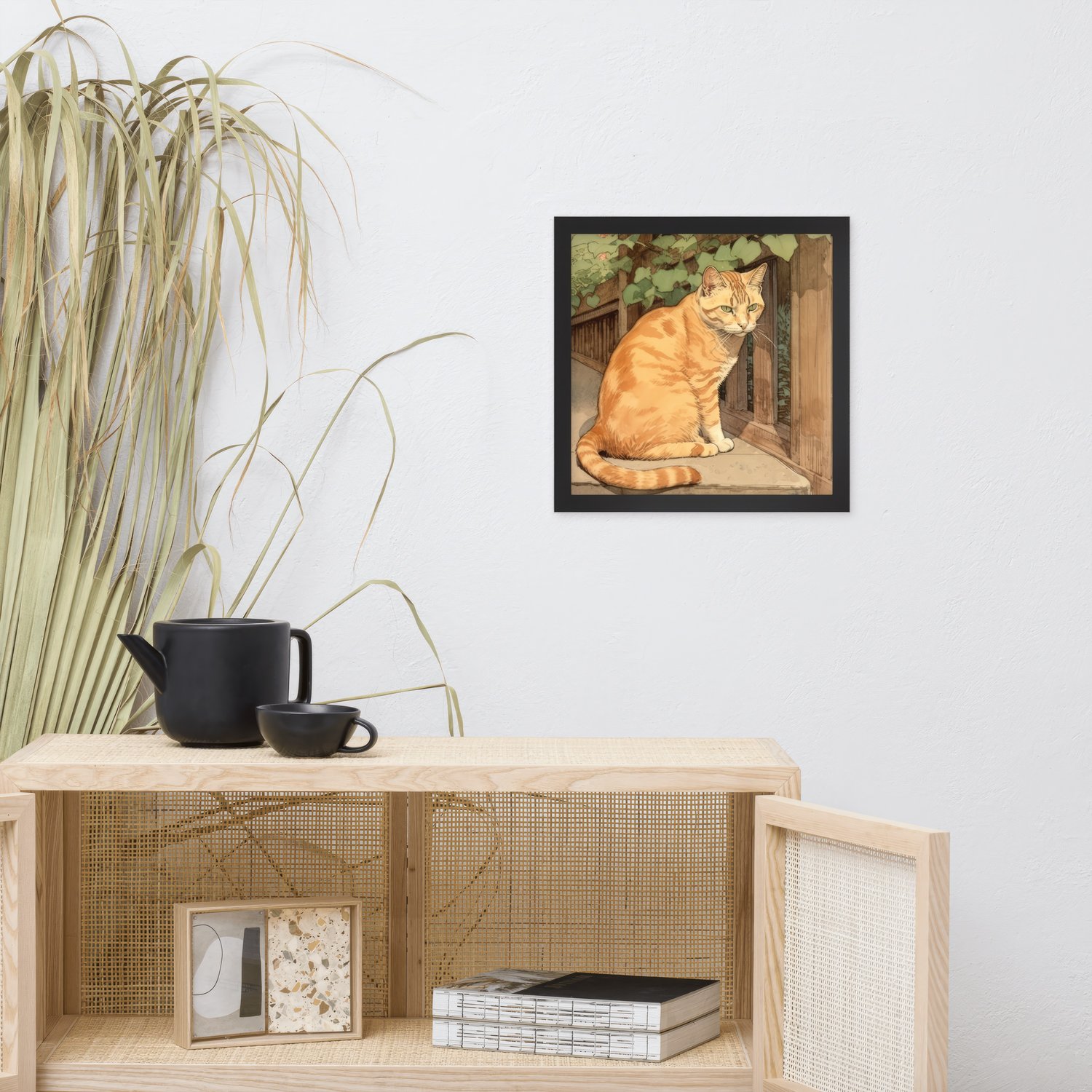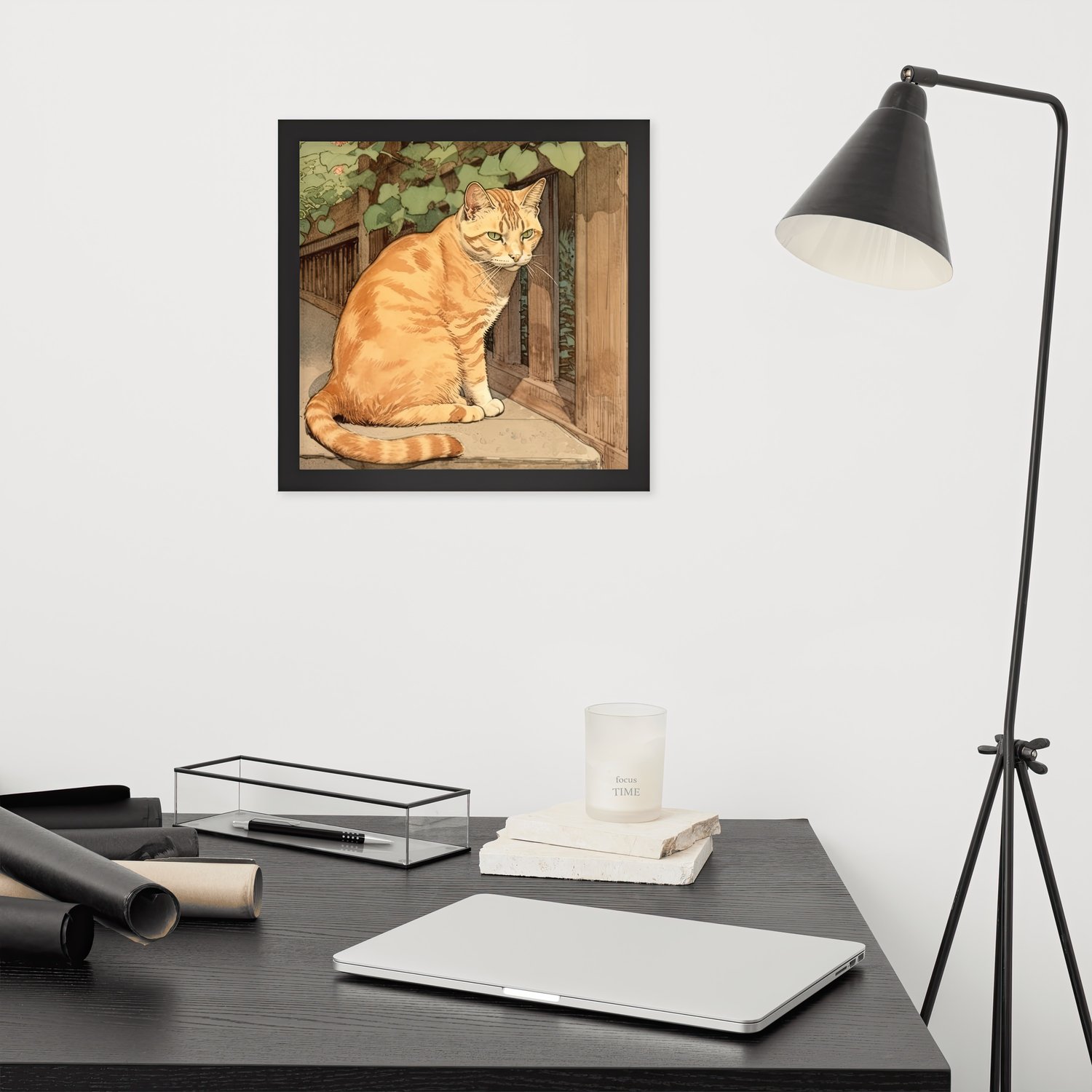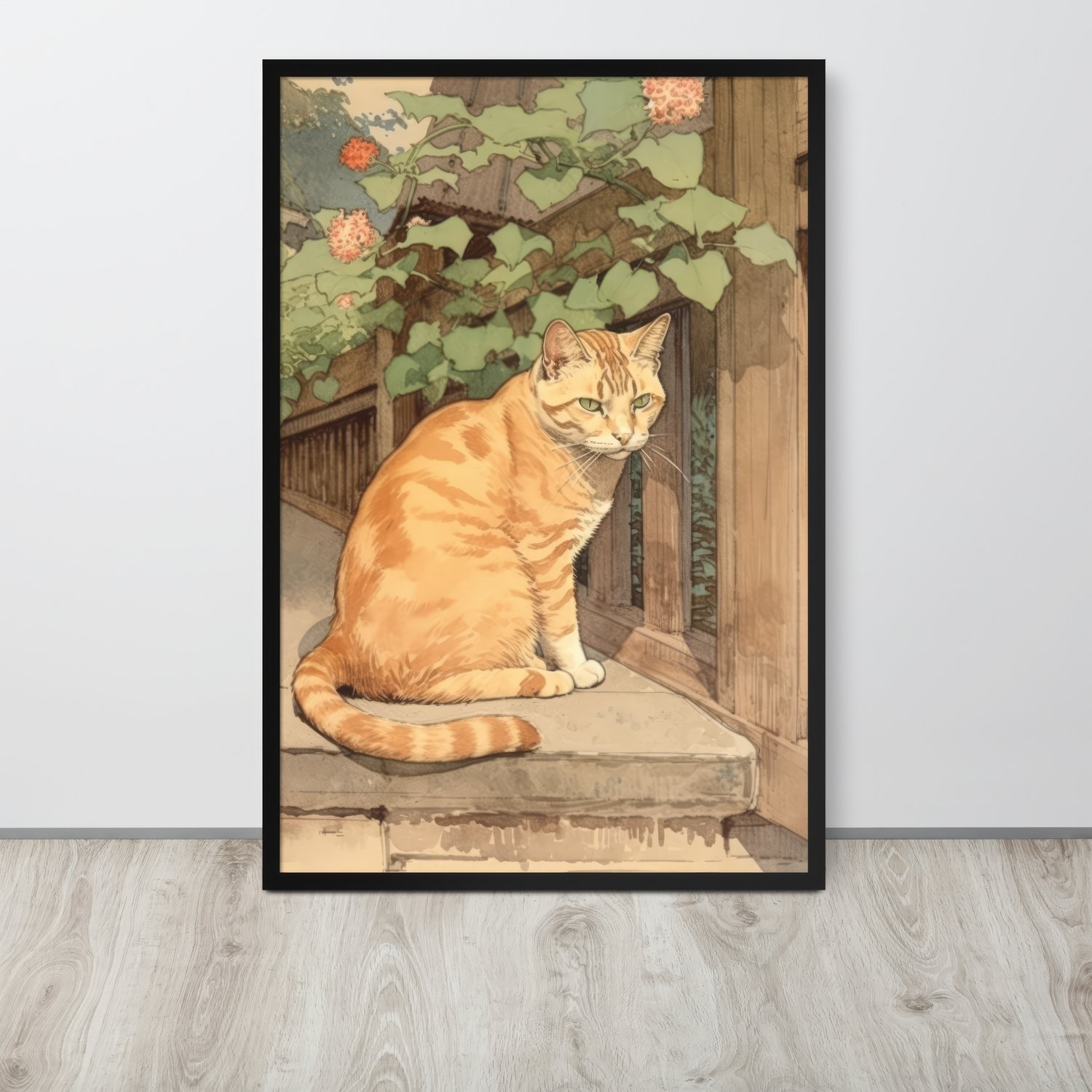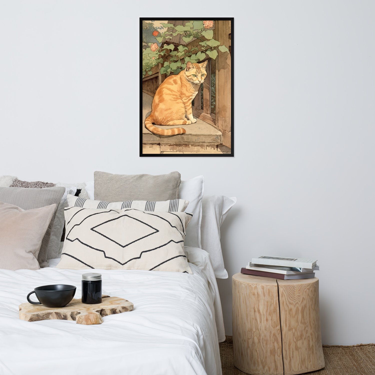 Adorable digital illustration of an orange cat sitting on the stair with blooming flowers in Japanese fine line drawing style. Perfect to decorate any space with a touch of cuteness and elegance.