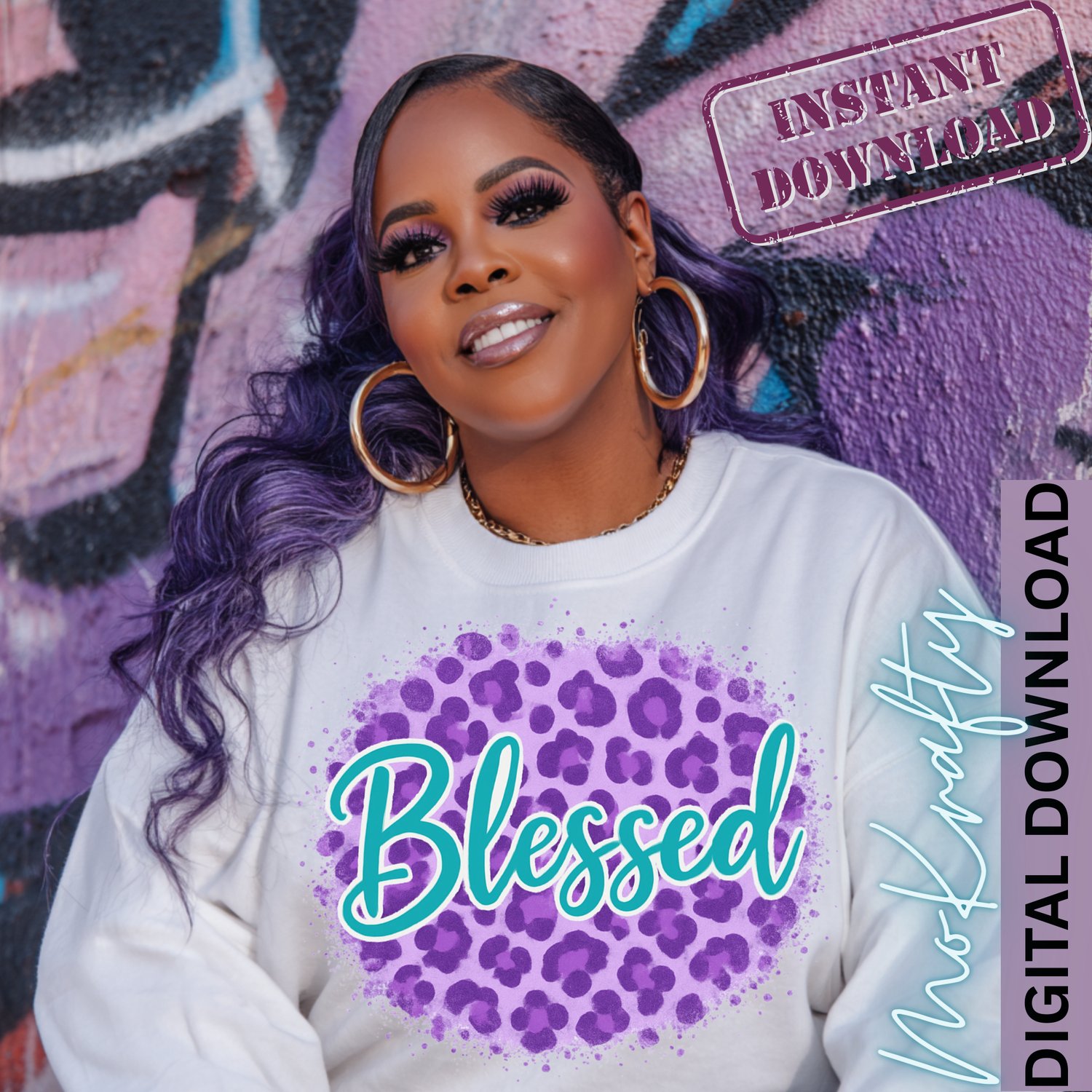Create stylish faith-based apparel with this Blessed Leopard PNG design! This bold and trendy design features a purple leopard print background with the word “Blessed” in a modern script font. Perfect for t-shirts, sweatshirts, tumblers, totes, and more.