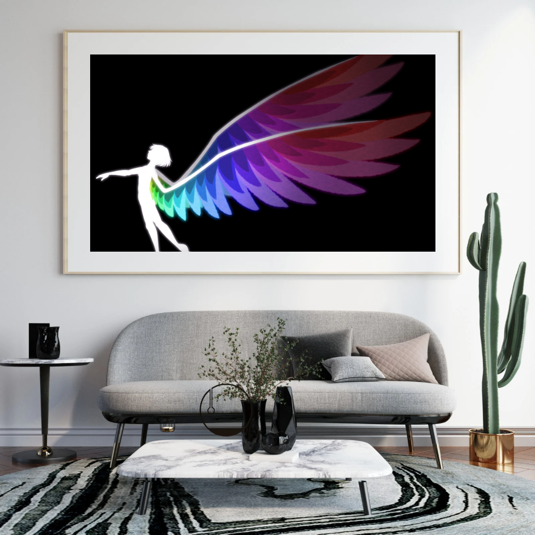 Dancing In The Dark portrays an angel dancing freely in a vast darkness, illuminated only by her own glow. With no one watching, she moves without restraint, her body light and expressive, mirroring the vibrant colors of her wings. The surrounding darkness emphasizes her solitude, but it is not lonely—it is liberating. Her colorful wings become a symbol of self-expression and inner light, showing that even in the absence of an audience, joy and freedom can exist. The artwork captures the idea of embracing oneself fully, dancing just because you can, and shining even when the world is quiet.