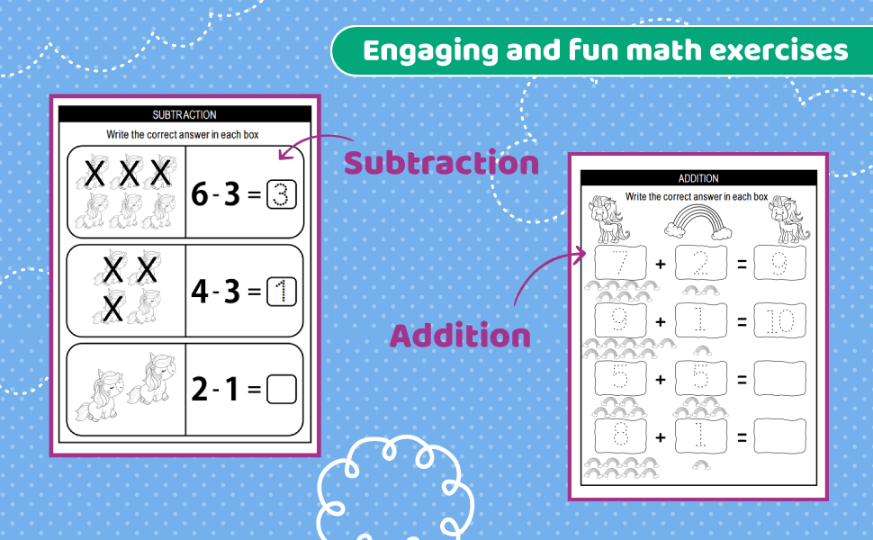 * Packed with addition and subtraction exercises, as well as activities that help kids learn to write numbers and count objects.