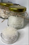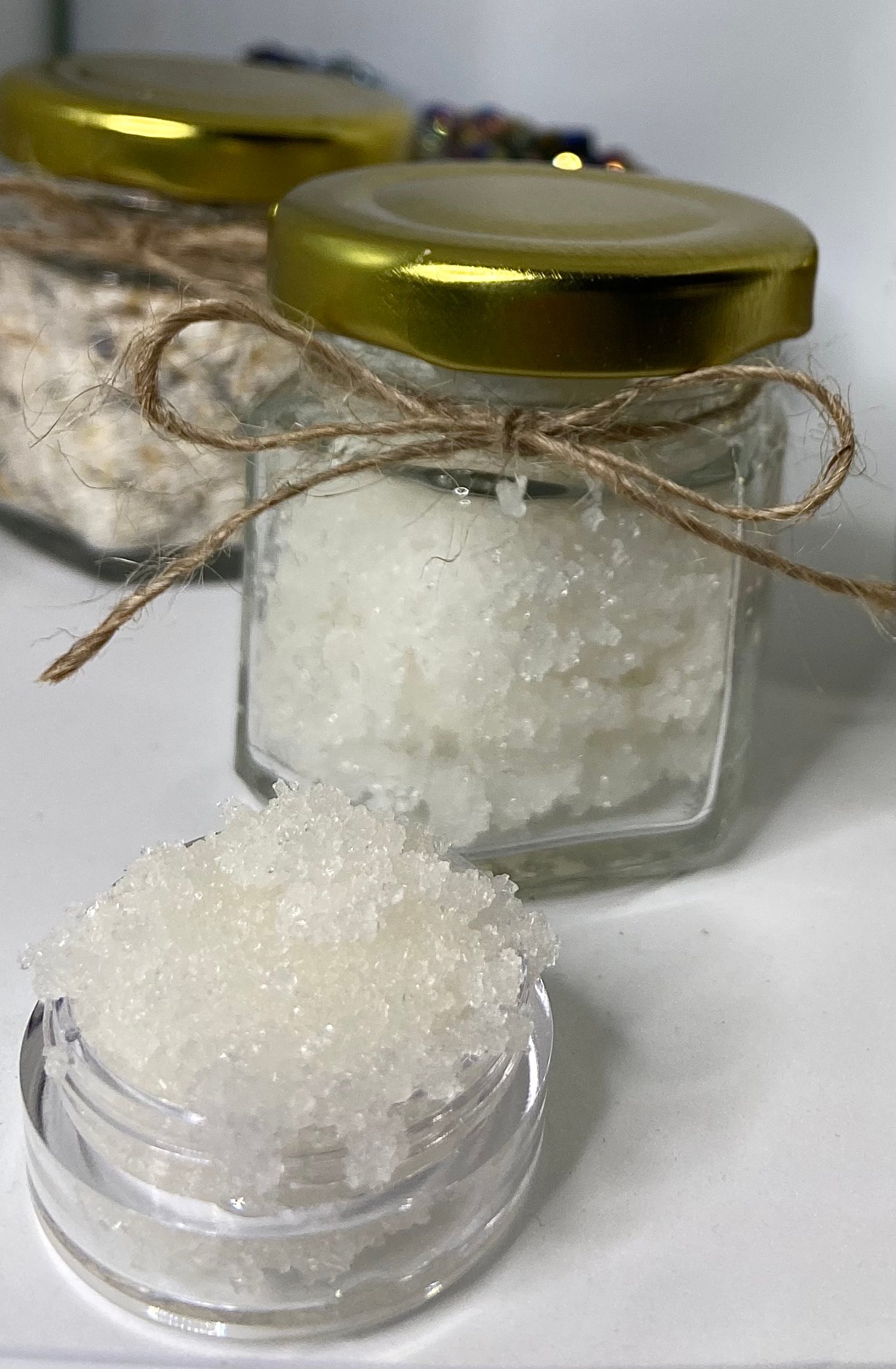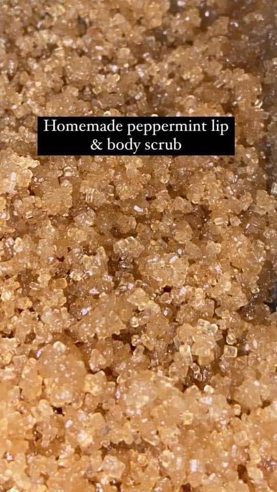 Peppermint sugar body scrub. Infused with vitamins A, D, E & K to nourish and mositurize your skin. Comes with a body scrub jar full of happiness. Use this on your lips, scalp, feet or any dry patch of skin to exfoliate and soothe your skin. Lip scrub size sample available upon request. White sugar or sugar in the raw.