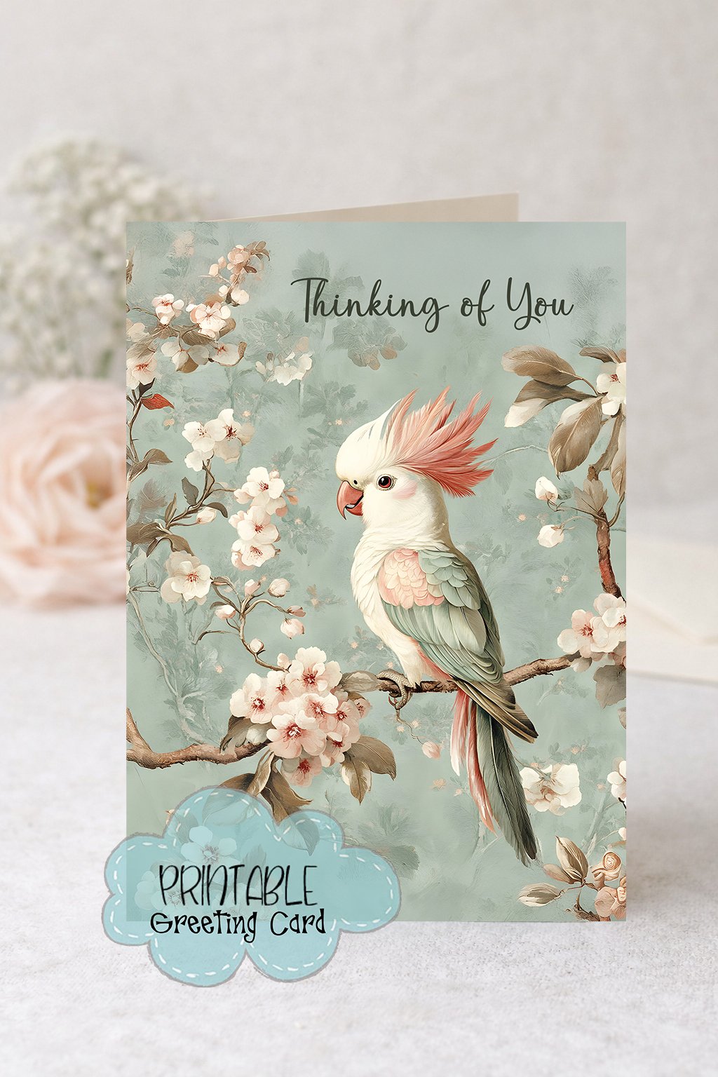 Printable Thinking of You Card Soft Floral Bird Design Instant Download