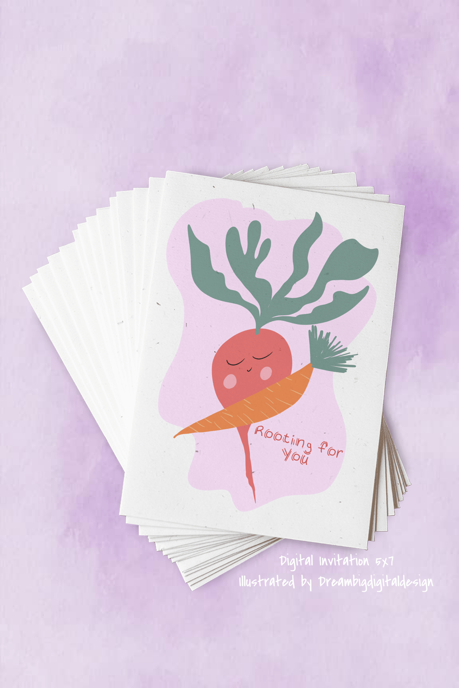 You will recieve this cute DIGITAL Radish carrying a carrot cute card. Illustrated by me this card is 5x7 and created with one of font collection lettering that says " Rooting for You " Great card to cheer that special some one. Also include is a PDF Format of the card side by side. Come back and visit our shop daily for other cute illustrations!