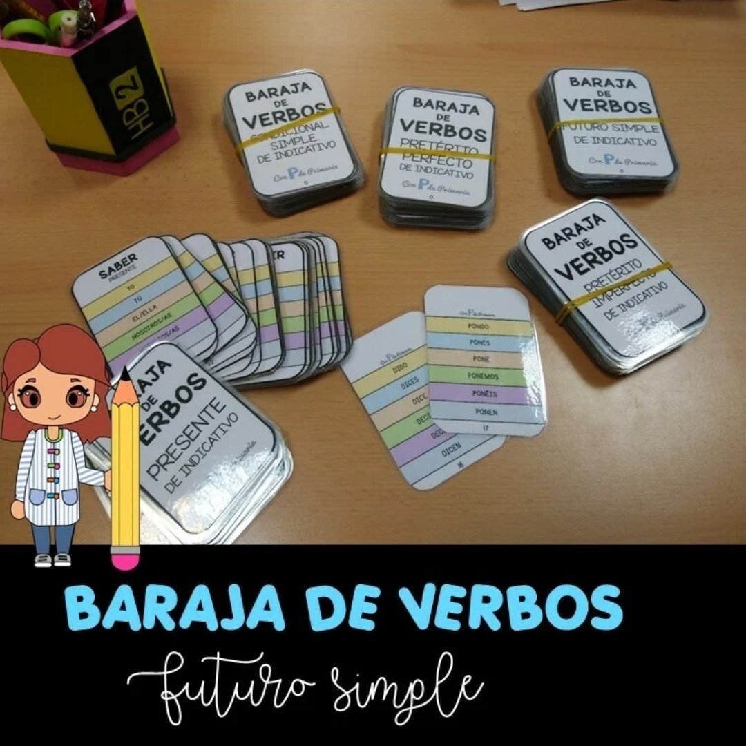 44 Cartas de doble cara con las conjugaciones de 44 verbos en Futuro simple de Indicativo.