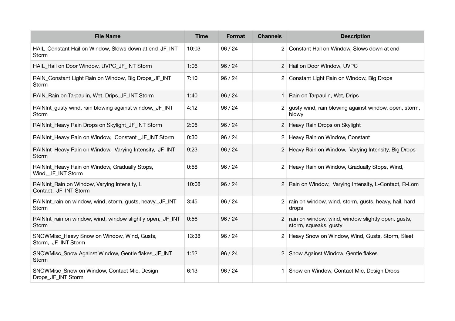 With a commitment to realism, these recordings capture the natural essence of indoor weather without artificial enhancements. Experience the bangs, deep, low gusts, and rattles of wind against windows, the rhythm of raindrops, hail, and snow on glass, and thunder through open and closed windows.