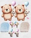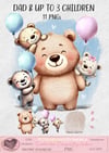 Father’s Day Bears. Birthday. Super adorable Daddy Bear and up to 3 children bears clipart. 2 backgrounds in blue or neutral & pink bows clipart. Sublimation, print. 11 PNGs. No text.