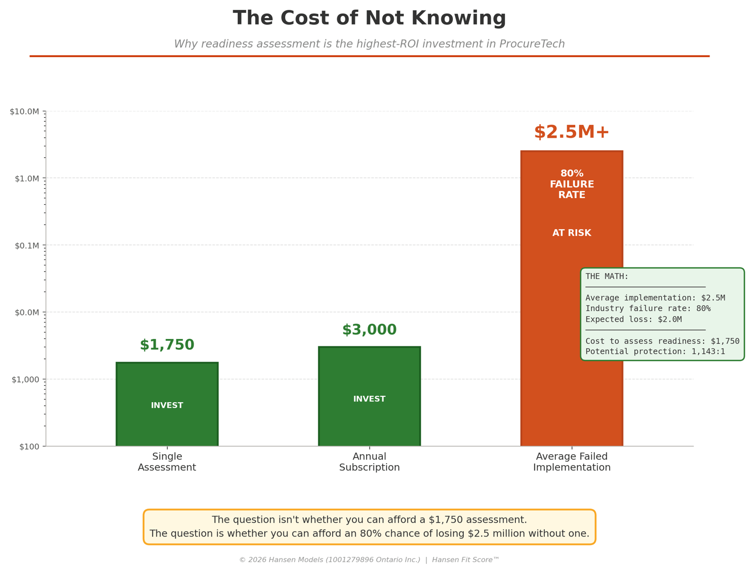 The average ProcureTech implementation costs $2.5 million. The industry failure rate is 80%. That means every implementation carries an expected loss of $2 million before it even begins.