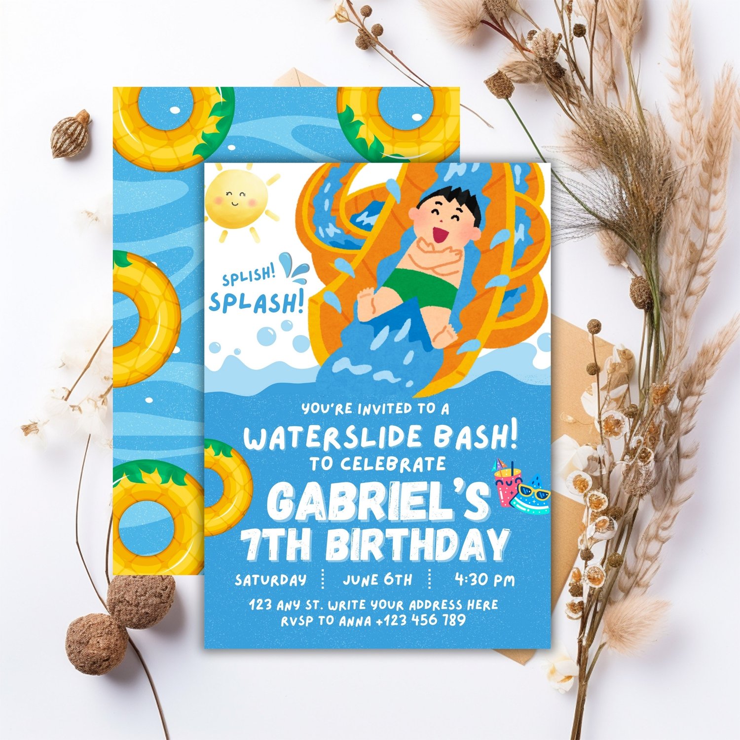 Make a splash with our vibrant Summer Waterslide Birthday Party Invitation Template, designed to bring excitement to your special event! Perfect for pool parties, water park celebrations, or any summer-themed gathering, this Canva template allows you to create a stunning invitation with ease.
