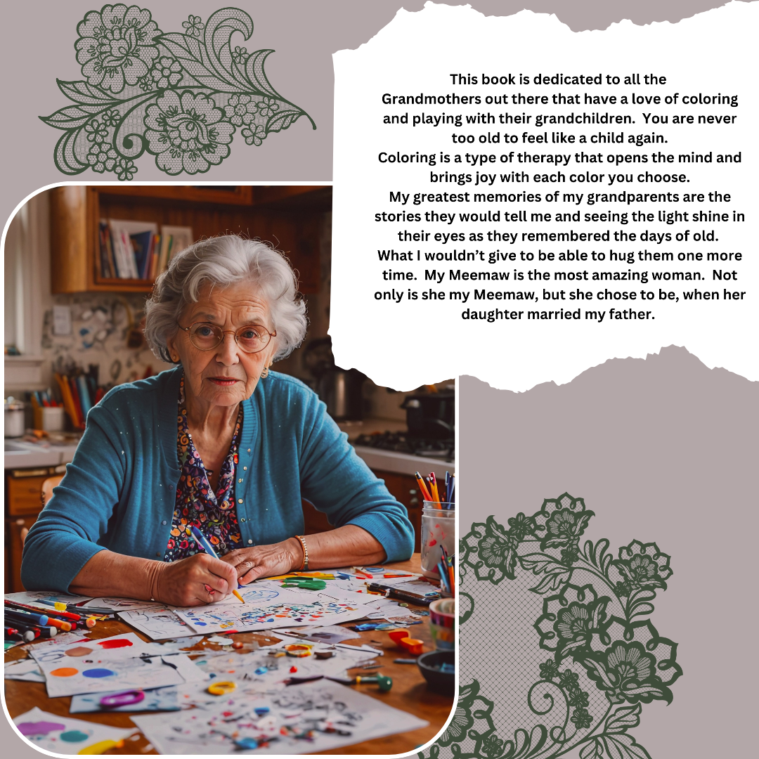 My Meemaw loves to color to stay young at heart. No one should ever feel like they are too old to have fun. Cherish the memories of your past and pass your knowledge on to your grandchildren. Each page is filled with pictures to color and bring joy and happiness to each day of your life. There are pages to fill with stories from your childhood and messages you want your grandchildren to remember for always.