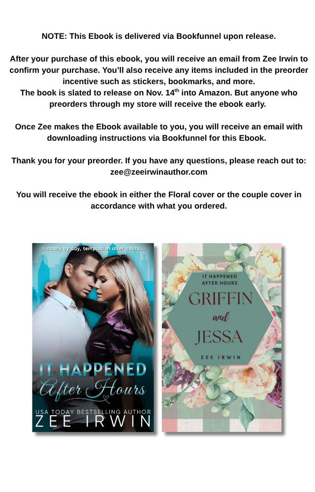 Note: This is a preorder for a new Ebook releasing Nov. 14, 2025. This will also release into Amazon and Kindle Unlimited, however, everyone who PREORDERS here on my store will receive the Ebook early, delivered via Bookfunnel, and Zee Irwin will notify readers when their download link is available. PLUS readers who preorder will receive a special thank you card from Zee Irwin, including a billionaire/nanny romance trope stickers and other stickers, an It Happened Series bookmark, two character bookmarks, and the Bookworm Bingo designed by Zee, only available to readers who preorder here. You also get your choice of couple cover ebook or floral cover ebook, whereas on Amazon it will only be the couple cover. You'll also get a Built-in bonus scene with no extra download required. And you get the good vibes of supporting me directly instead of giving Amazon their cut.