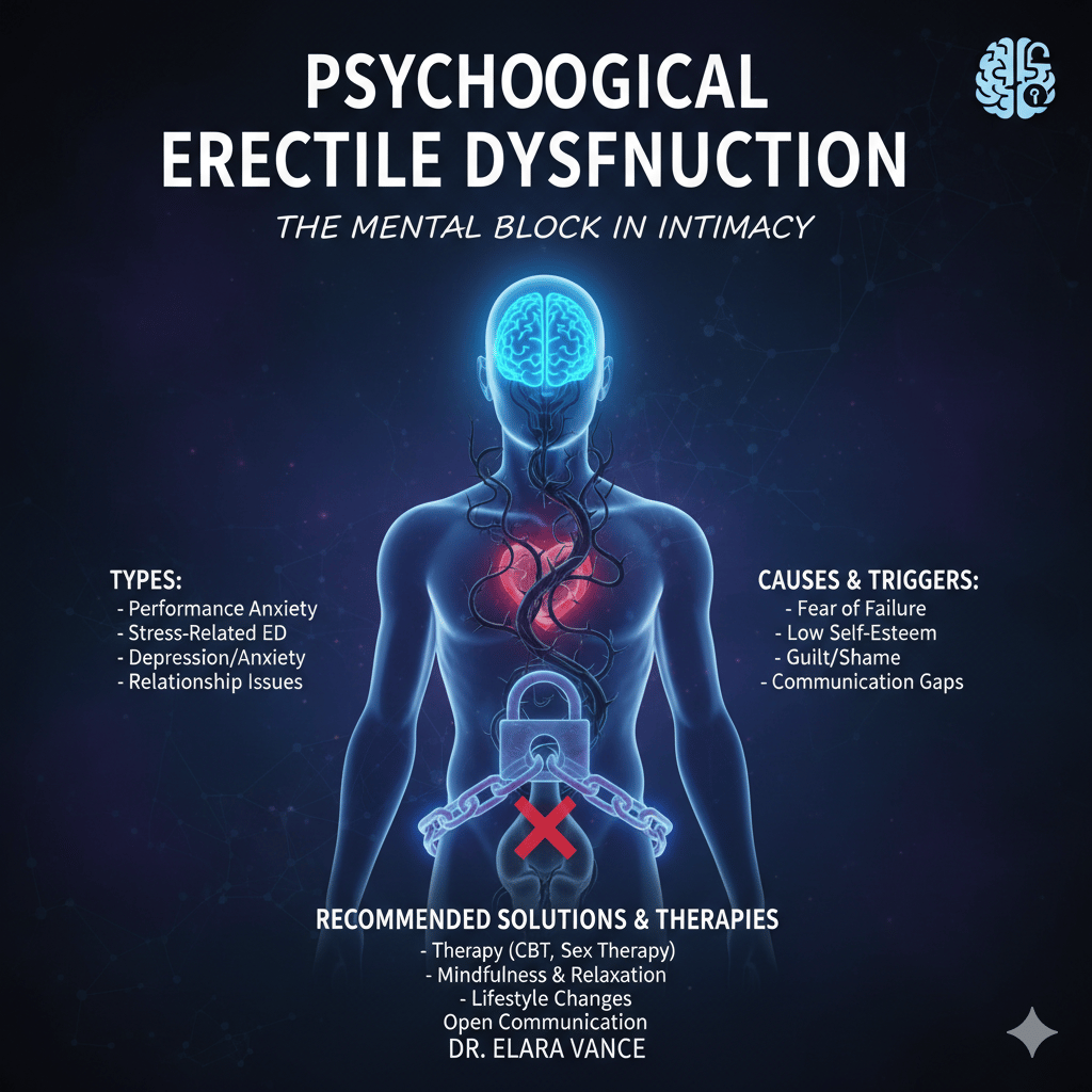 "Psychological Erectile Dysfunction: The Mental Block in Intimacy. Types of Psychological Erectile Dysfunction,Main Causes and Triggering Factors,Recommended Solutions and Therapies"