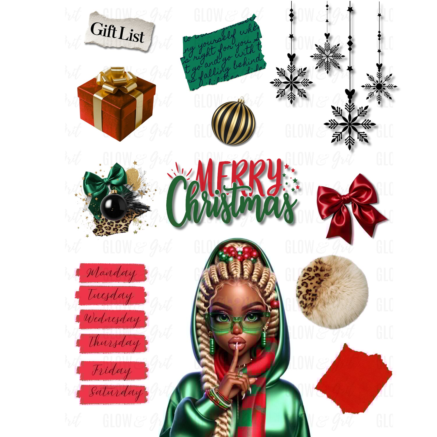 ✨ Emerald Holiday Stickers – African American Dolls | Digital Planner Pack