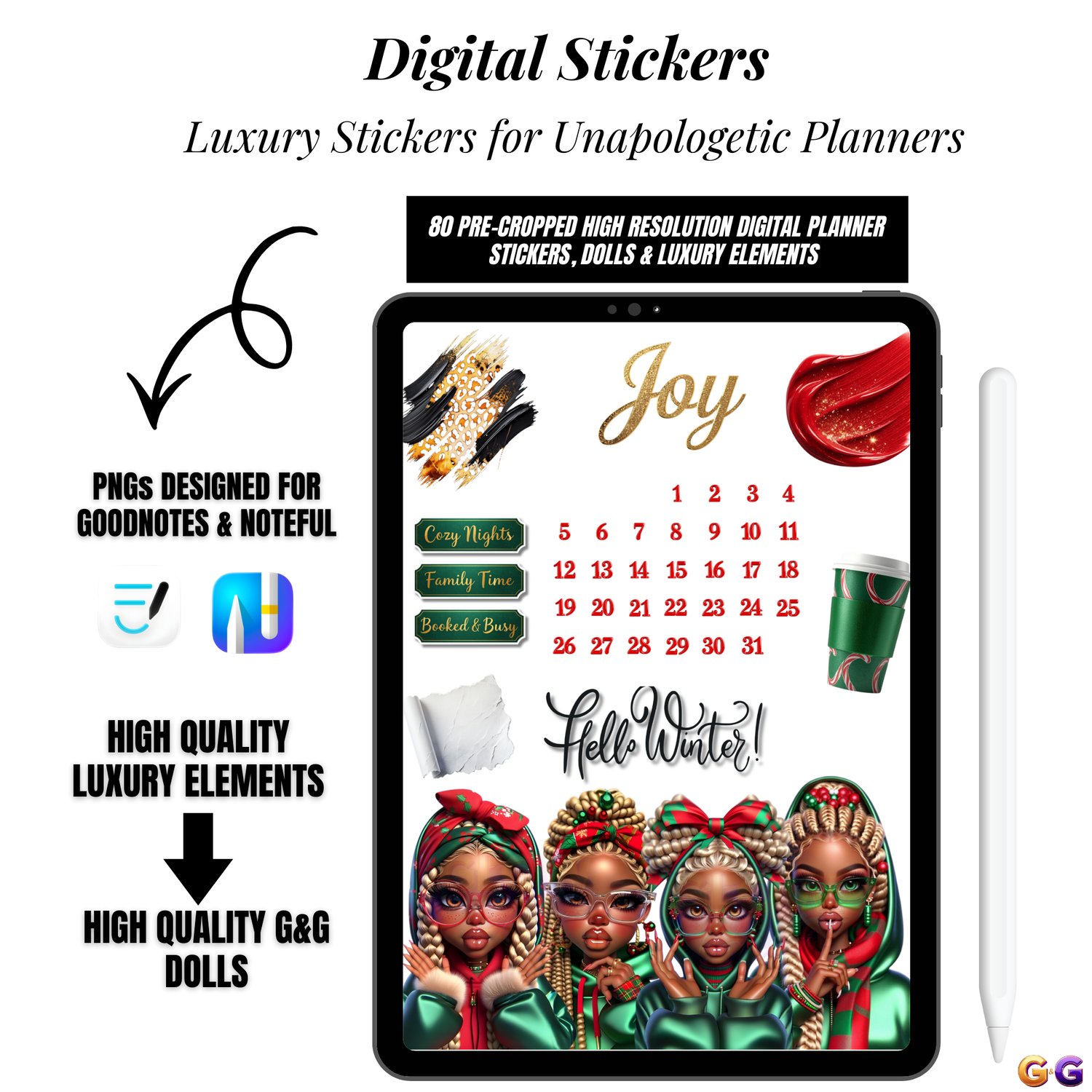 Luxury holiday digital planner stickers featuring glam African American dolls, seasonal décor, and stylish functional elements. Perfect for GoodNotes, Noteful, and aesthetic holiday spreads that glow.