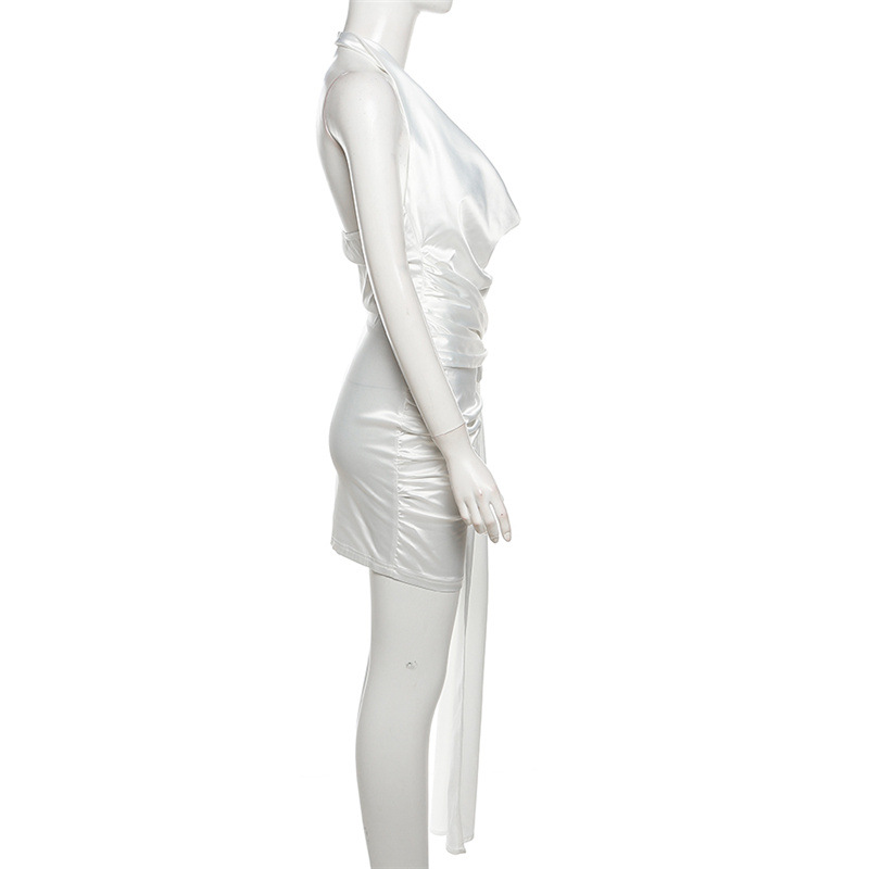 Designer white satin pleated waist mini halter neck vest dress