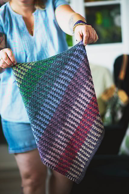I love how knitting on the bias can take the ordinary and turn it on edge! Here, simple two-tone stripes become much more as they’re nestled together in a tuck stitch pattern.