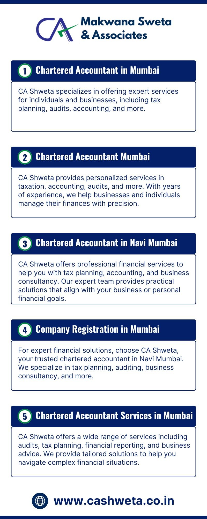 Looking for professional chartered accountant services in Mumbai? CA Shweta offers a wide range of services including audits, tax planning, financial reporting, and business advice. We provide tailored solutions to help you navigate complex financial situations. Contact CA Shweta for reliable chartered accountant services in Mumbai and get expert support today.