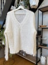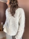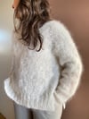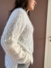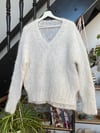 The Cloud Dancer pullover is worked from the top down in stockinette stitch with one strand of thick and fluffy mohair yarn. The design has a deep rounded V-neck. All edges are finished with 2 x 2 rib.