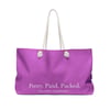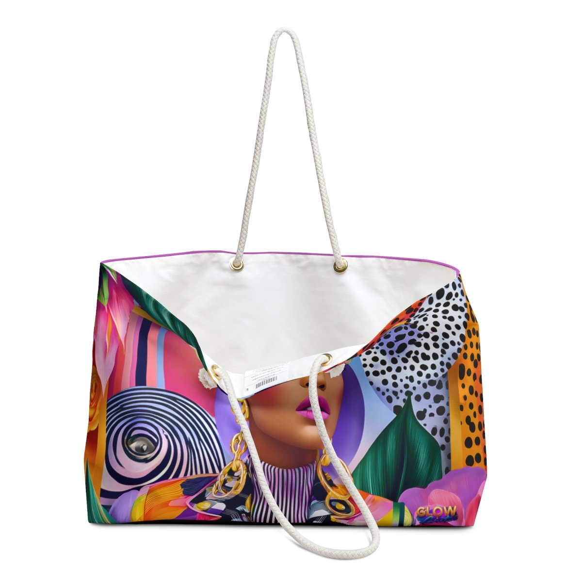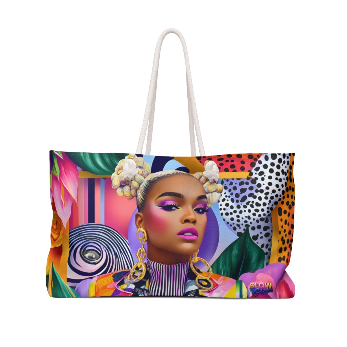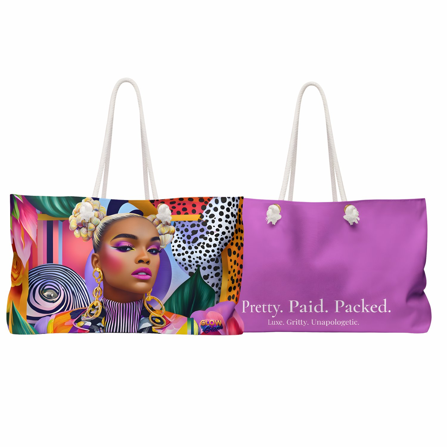 The Soft Power Weekender celebrates the woman who leads with grace, intention, and quiet strength. Vibrant editorial artwork wraps the exterior in expressive color, while the bold “Pretty. Paid. Packed.” statement on the back adds a confident reminder that power can be both beautiful and unbothered.
