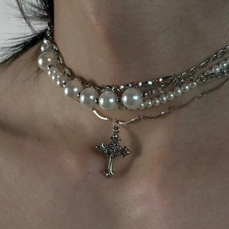 Vintage style pearl chain cross multilayer stacking choker necklace